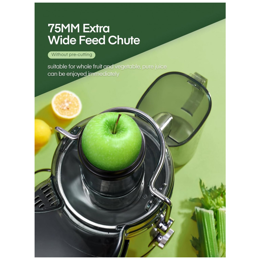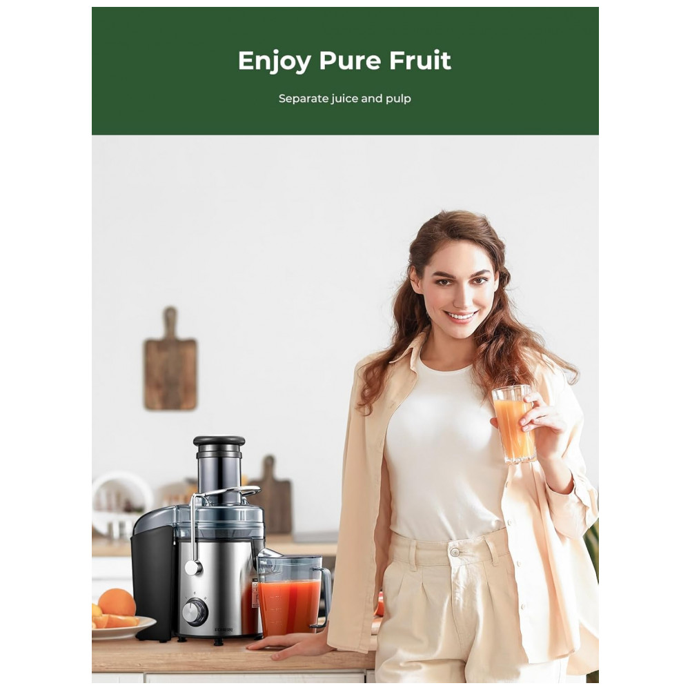 Suco eficiente de 1000 W Com seu motor potente de 1000 W, a máquina espremedora precisava de apenas 2 minutos para encher uma xícara de suco. O suco de frutas e vegetais traz muitos benefícios à saúde. É um desafio obter vitaminas específicas, como a vitamina C, de outras fontes além das frutas cítricas. Um copo de suco por dia mantém você saudável e vital