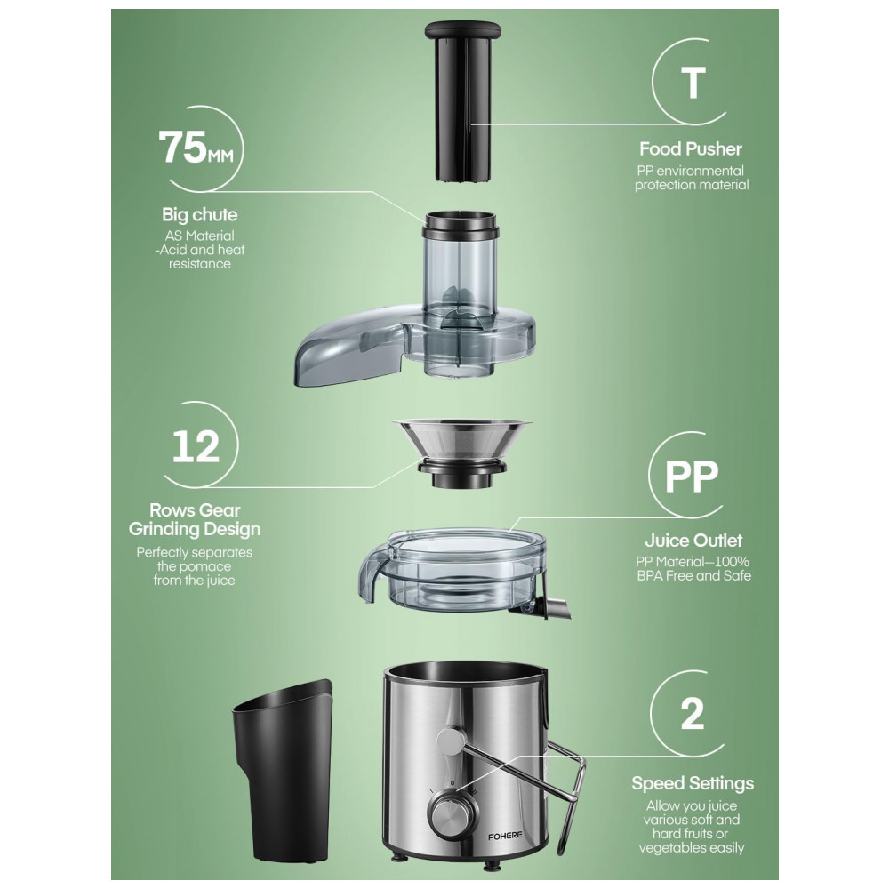 Centrífuga de Frutas e Vegetais com Velocidade Dupla e Pés Antiderrapantes 110V 1000W FOHERE Prata