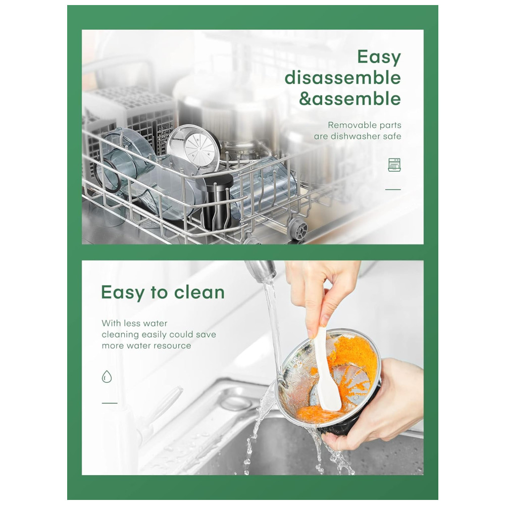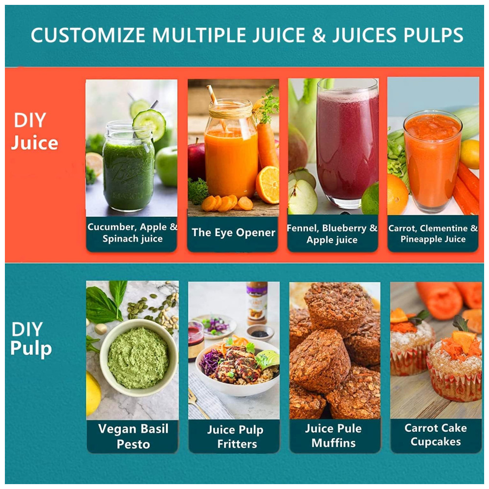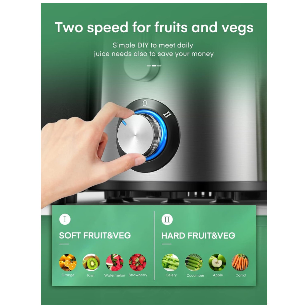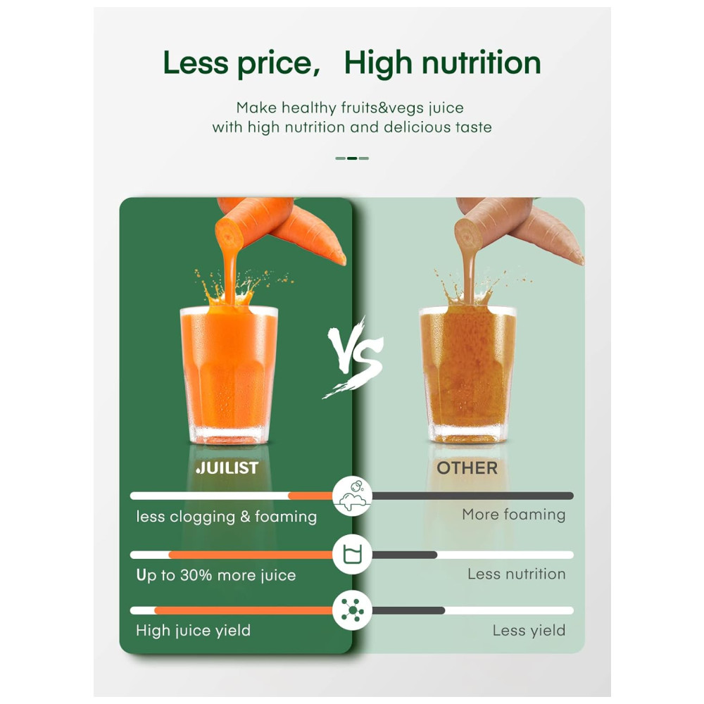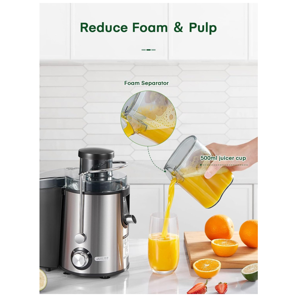 O extrator de suco centrífugo Juilist modelo GS-310L possui motor potente de 400 watts e duas velocidades para otimizar o rendimento conforme o tipo de fruta ou vegetal: velocidade baixa para frutas macias e alta para alimentos mais rígidos. Conta com boca de alimentação larga de 65 mm (3 polegadas) que permite inserir pedaços maiores, reduzindo o tempo de preparo. O corpo é confeccionado em aço inoxidável resistente à corrosão e plástico ABS, garantindo durabilidade e fácil limpeza. Inclui sistema anti-gotejamento que evita derramamentos, além de um separador de espuma embutido garantindo sucos mais lisos e saborosos. Equipado com proteção contra superaquecimento e trava de segurança que impede o funcionamento com tampa aberta. Componentes removíveis são compatíveis com lava-louças para praticidade na limpeza.