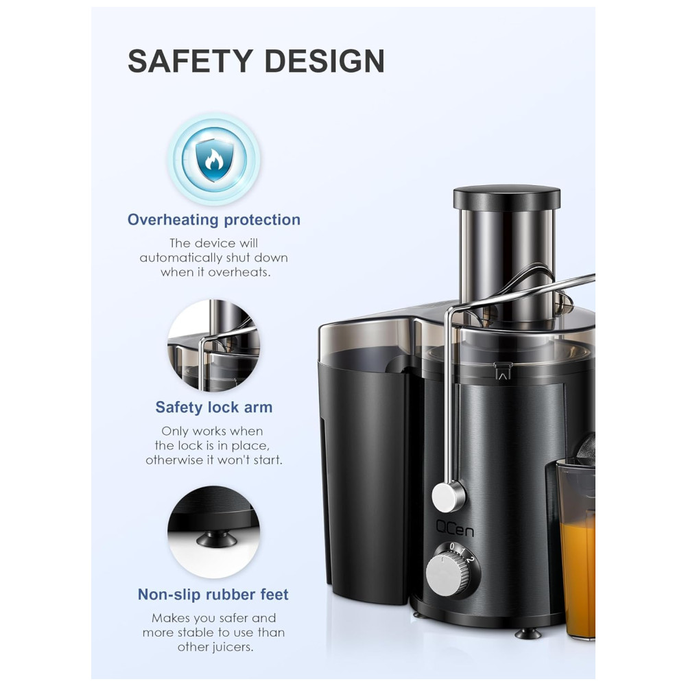 Design de segurança e fácil de limpar Extrator de suco com braço de sistema de travamento, não funcionará sem a tampa travada no lugar. O sistema de proteção contra sobrecarga desligará a máquina assim que ocorrer superaquecimento. Peças removíveis facilitam a limpeza