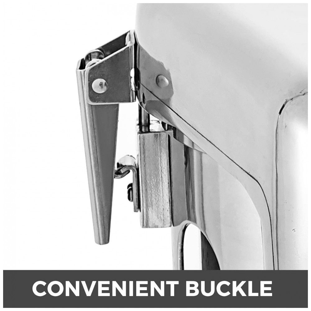 Design atencioso Duas fivelas resistentes ligam firmemente o corpo e a tampa da máquina sem vazamentos. A base para serviços pesados reduz o centro de gravidade e garante uma operação mais estável. Botão simples de LIGAR , DESLIGAR e redefinir para uso conveniente. Almofadas de pé reduzem a vibração.