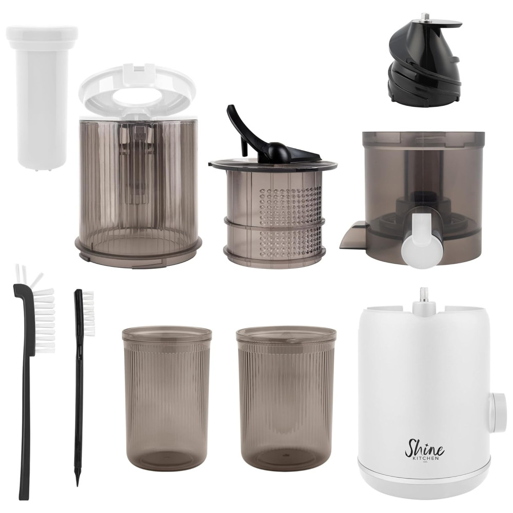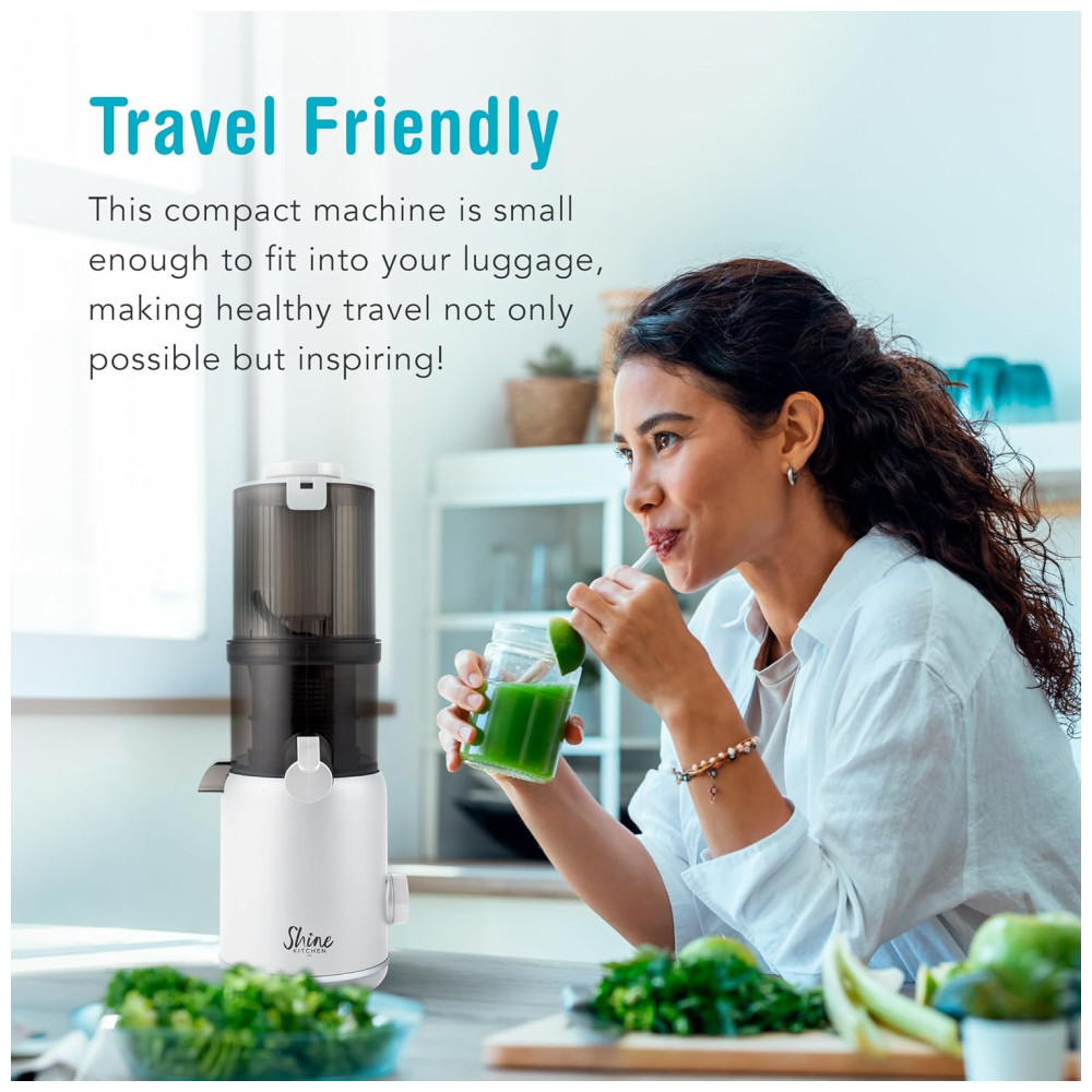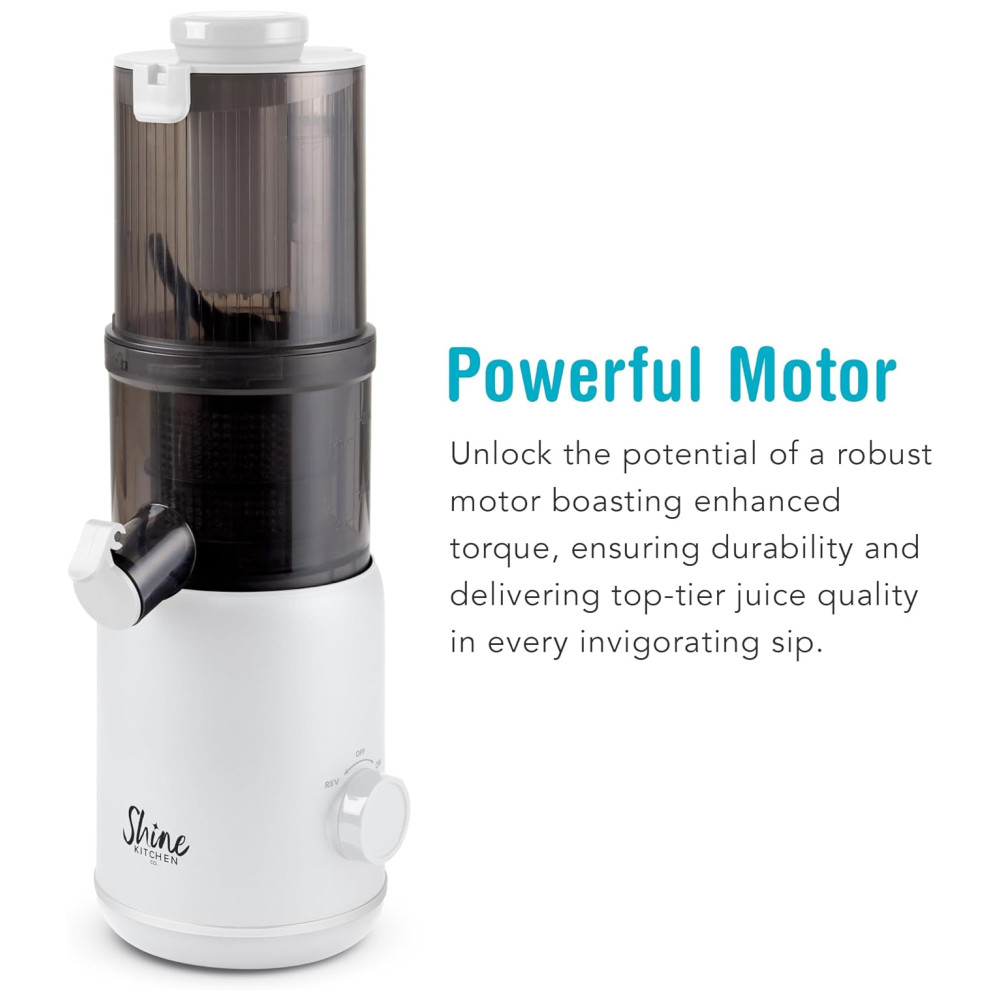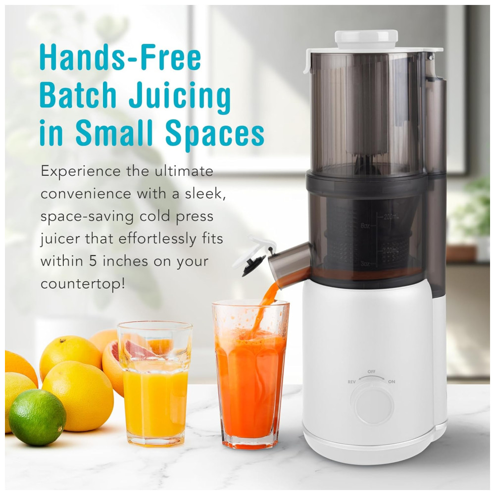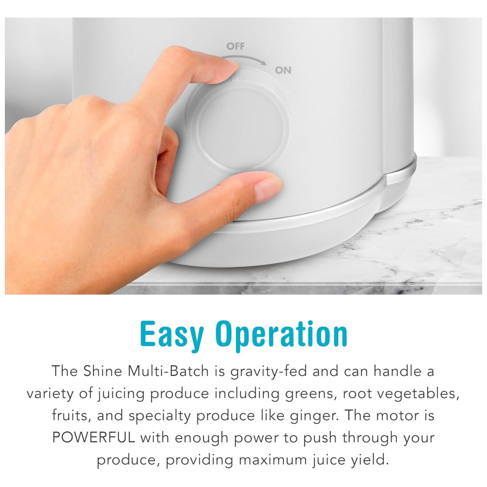 Desfrute de sucos frescos e nutritivos com o espremedor de frutas a frio Shine MultiBatch. Este produto compacto cabe facilmente em bancadas com menos de 5 polegadas, permitindo que você faça sucos em lote com as mãos livres. Basta carregar o funil com suas frutas e vegetais favoritos, pressionar o botão Iniciar e desfrutar de sucos repletos de sabores e nutrientes vibrantes.