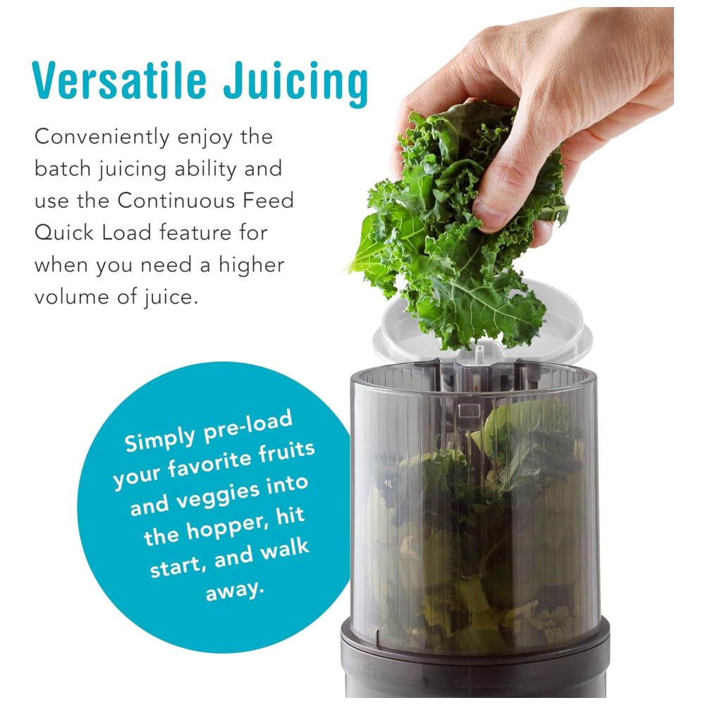 O recurso Continuous Feed Quick Load permite que você processe grandes volumes de ingredientes de uma só vez. Com um motor potente e durável, este espremedor processa eficientemente vários ingredientes, desde vegetais folhosos até vegetais de raiz robustos, frutas e até itens especiais como gengibre.