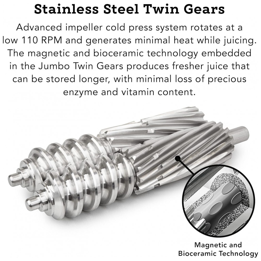 PRODUZ SUCO FRESCO A tecnologia magnética e biocerâmica incorporada no Jumbo Twin Gears extrai suco denso em nutrientes que pode ser zenado por mais tempo. Recessos de bolso e posições de corte auxiliam na moagem e extração de suco