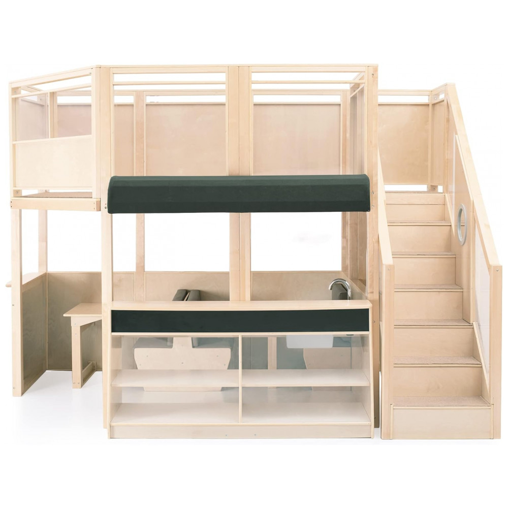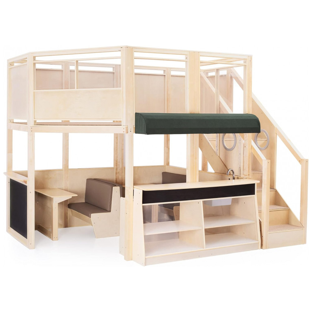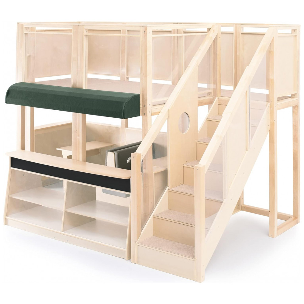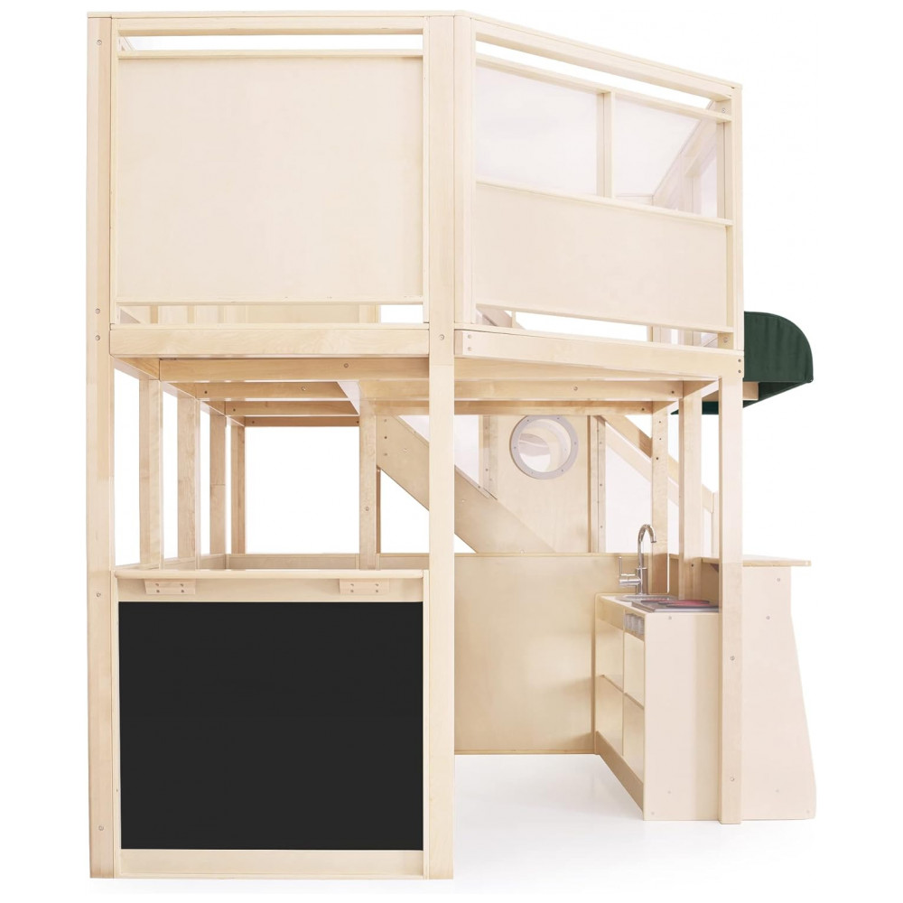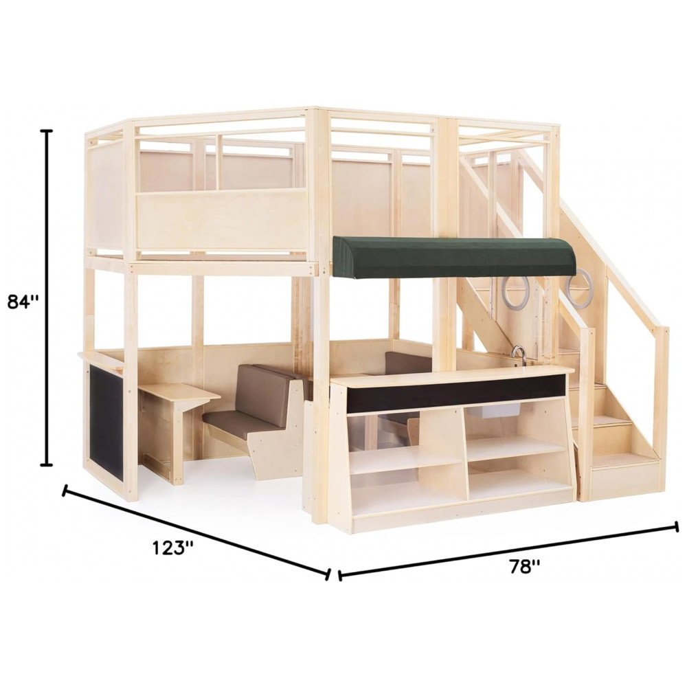 Centro multisensorial de atividades infantil Guidecraft Café Loft Natural com cozinha de faz de conta área de escalada e lousa 312cm
