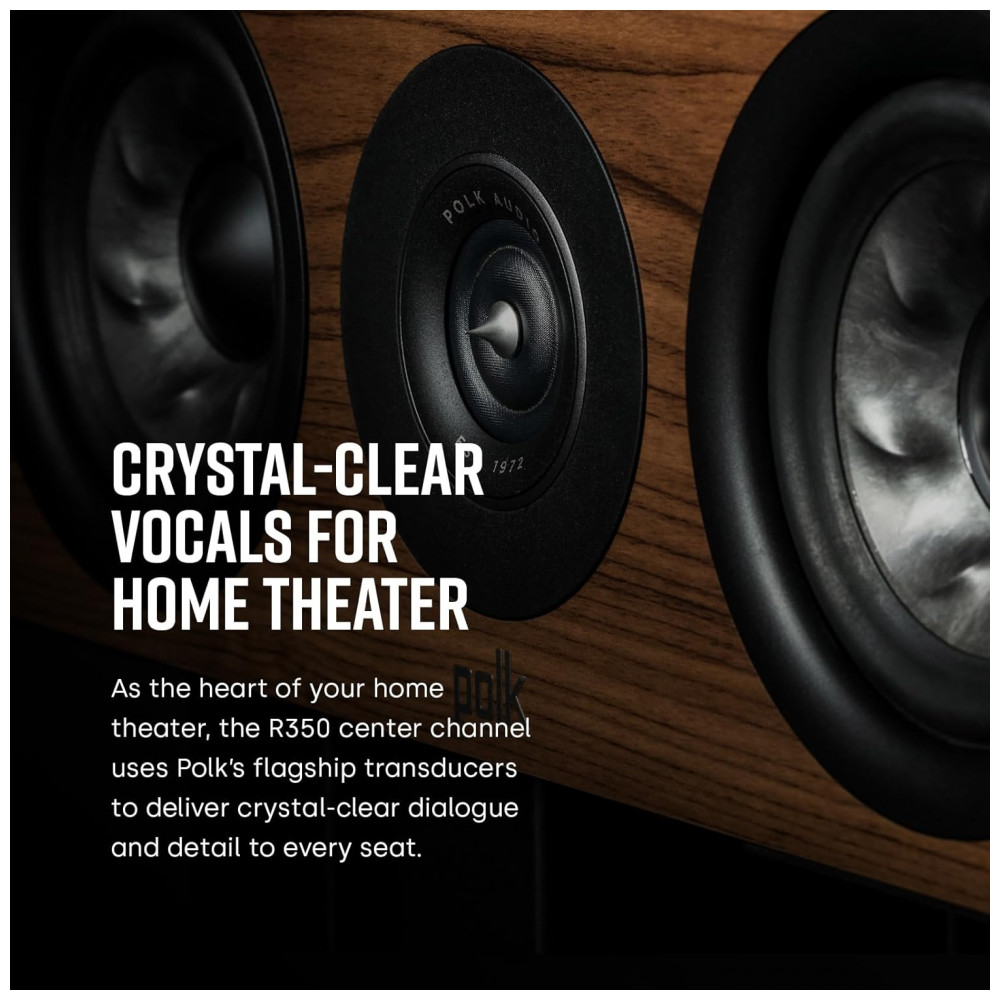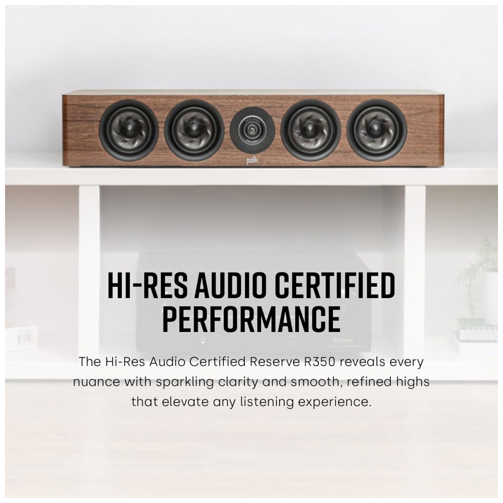 A caixa acústica Polk Audio Reserve R350 é um alto-falante passivo de perfil slim projetado para atuar como canal central em sistemas de home theater e também como caixa esquerda/direita de surround quando instalada na posição vertical. Ela utiliza um tweeter Pinnacle Ring Radiator combinado a quatro woofers Turbine Cone, permitindo reprodução de agudos definidos, médios detalhados e boa extensão de graves em um gabinete de baixa profundidade.