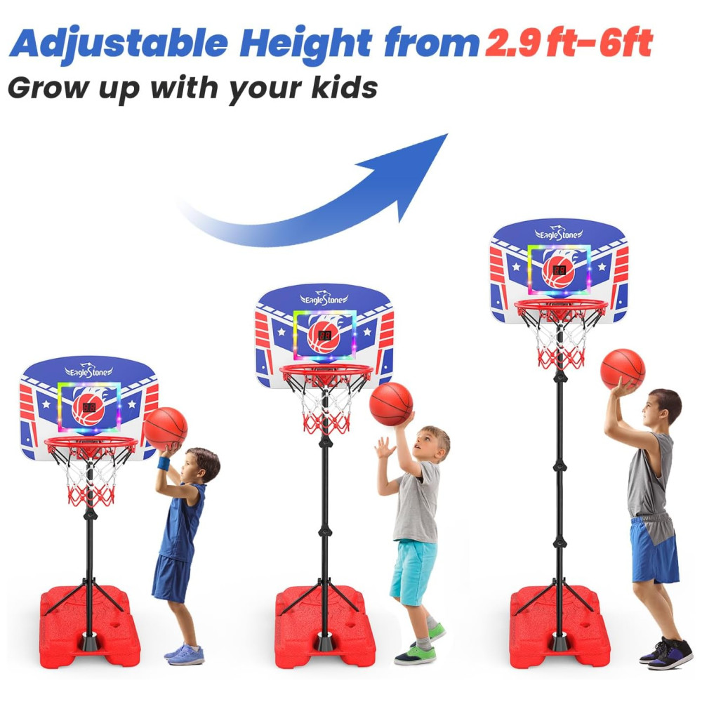 Altura Ajustável de 88,5 cm a 1,83 m: A cesta de basquete ajustável pode ser configurada em três alturas diferentes (de 88,5 cm a 1,83 m), garantindo que ela acompanhe o crescimento da criança. Isso permite um uso prolongado e adapta-se perfeitamente ao desenvolvimento físico de meninos e meninas.