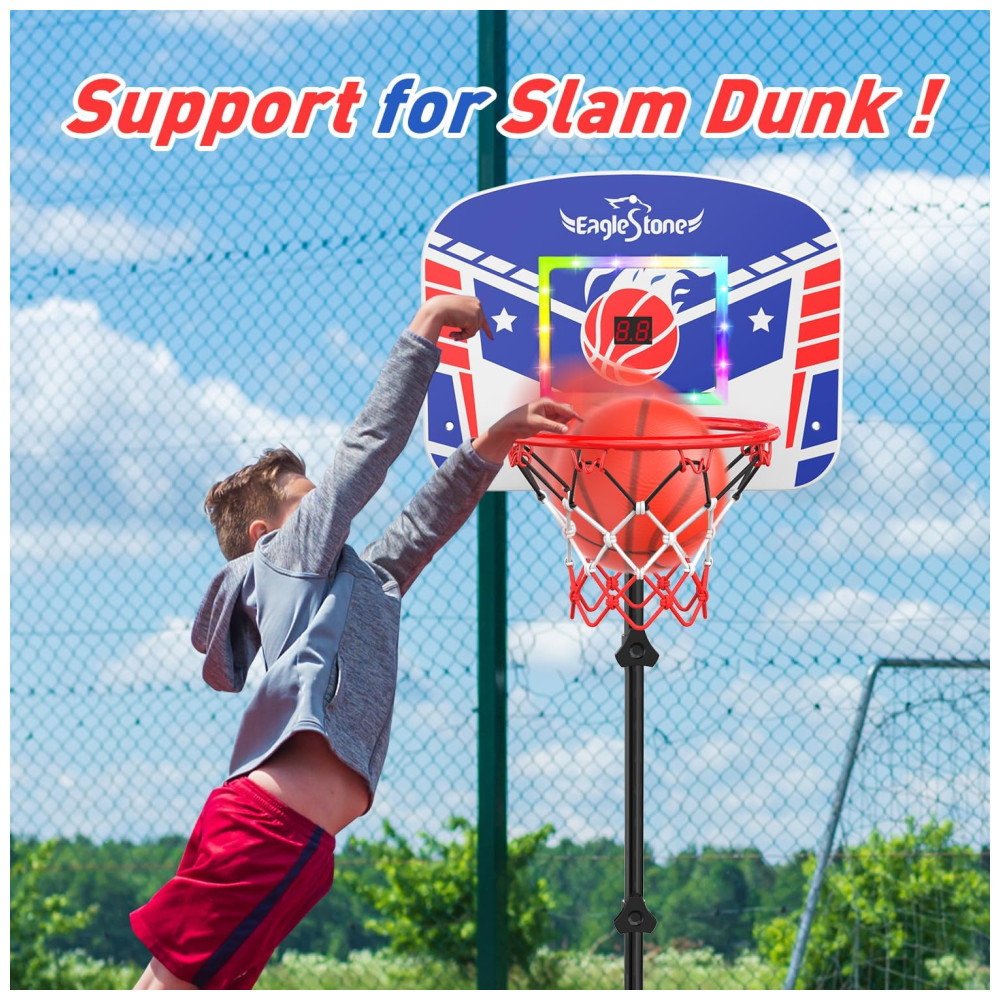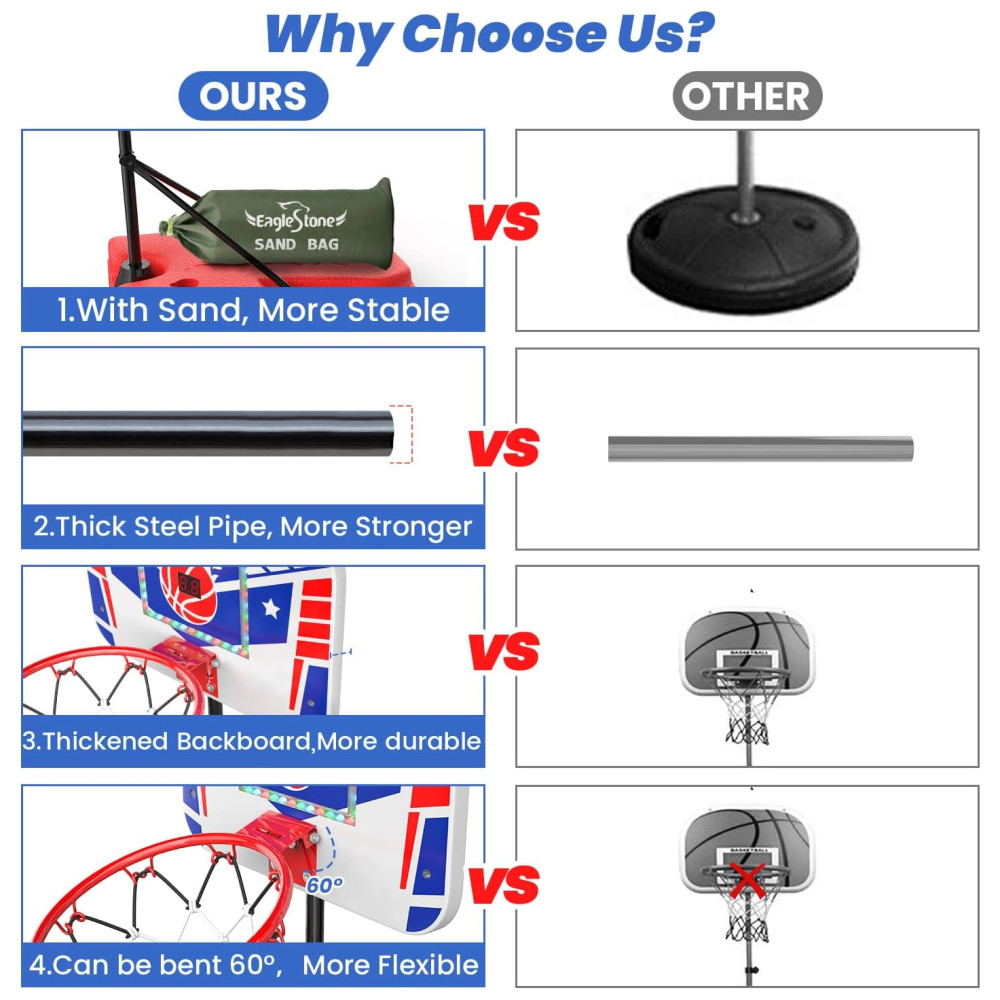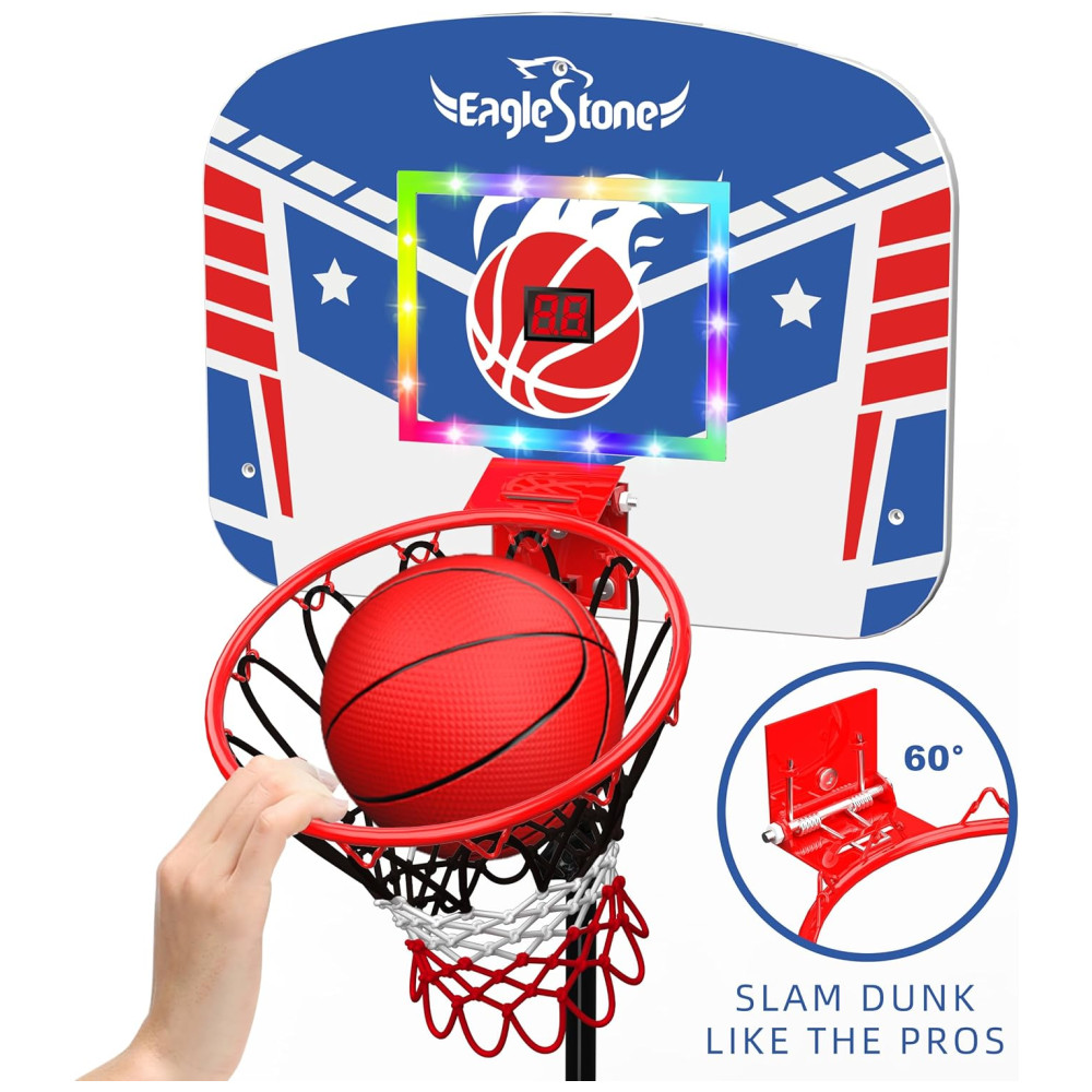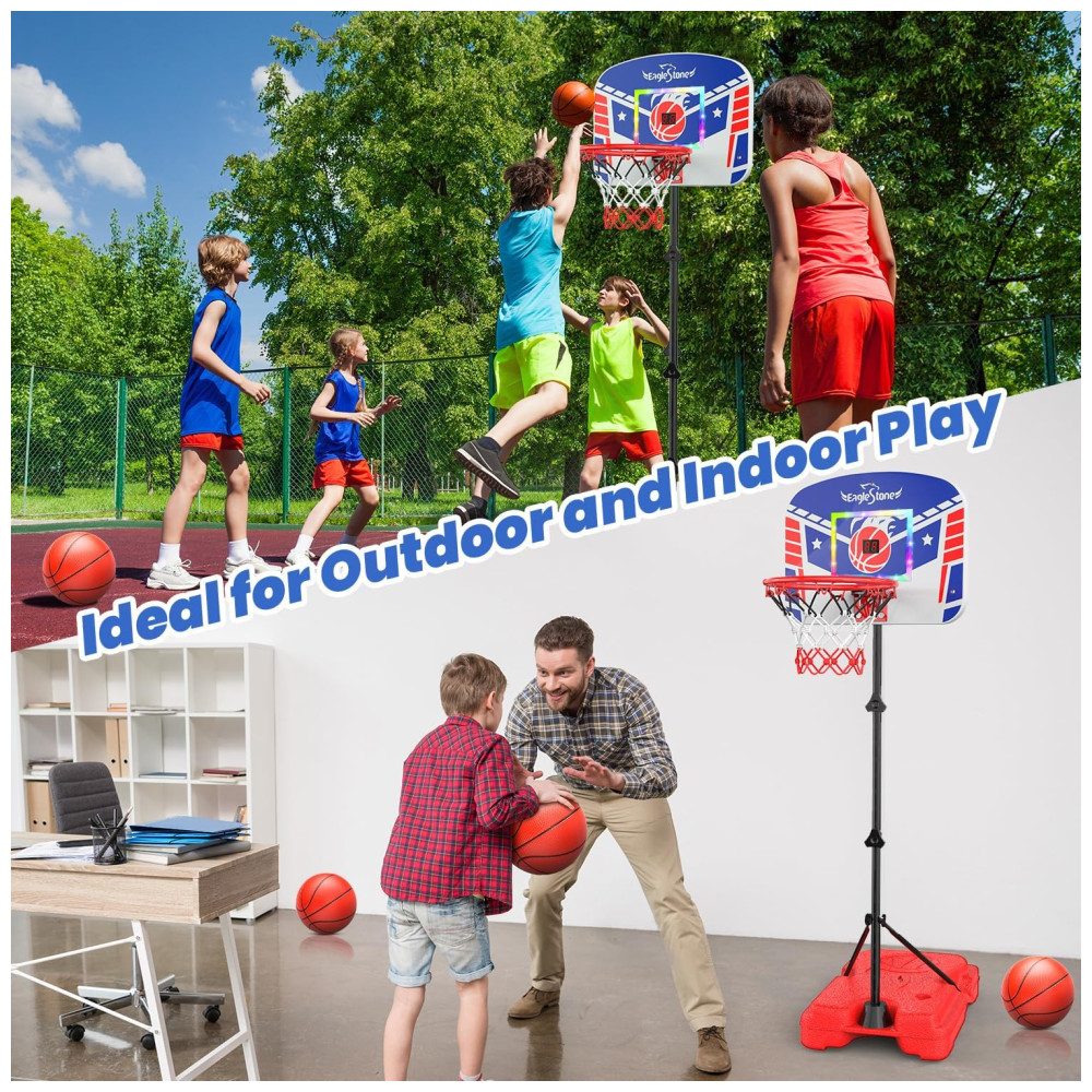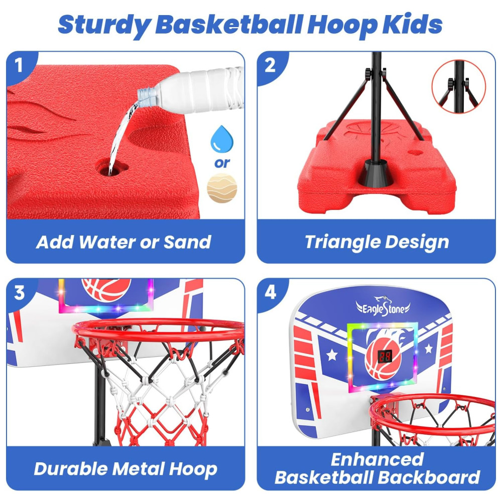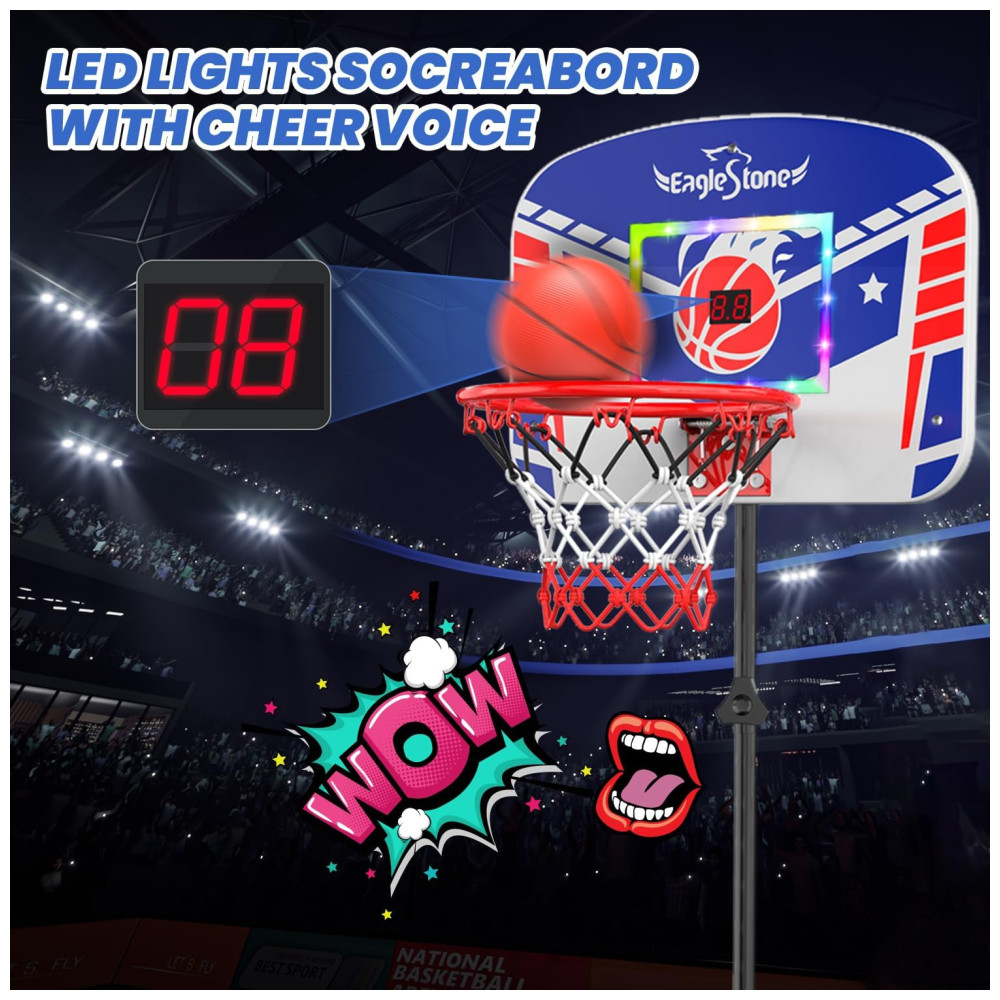 Cesta de Basquete com 3 Bolas Placar Eletrônico Iluminação LED Sons de Torcida e Altura Ajustável de 90 cm a 18 metros Eaglestone Azul e Vermelho