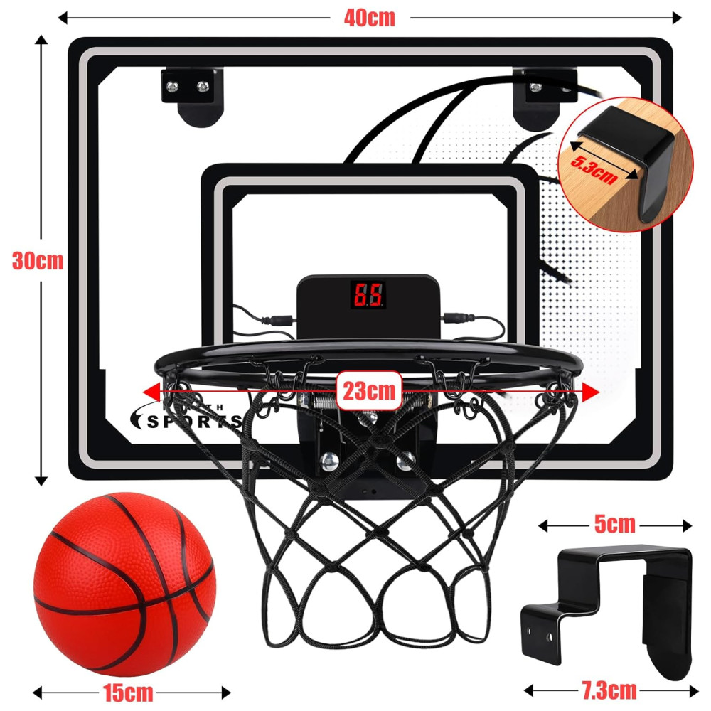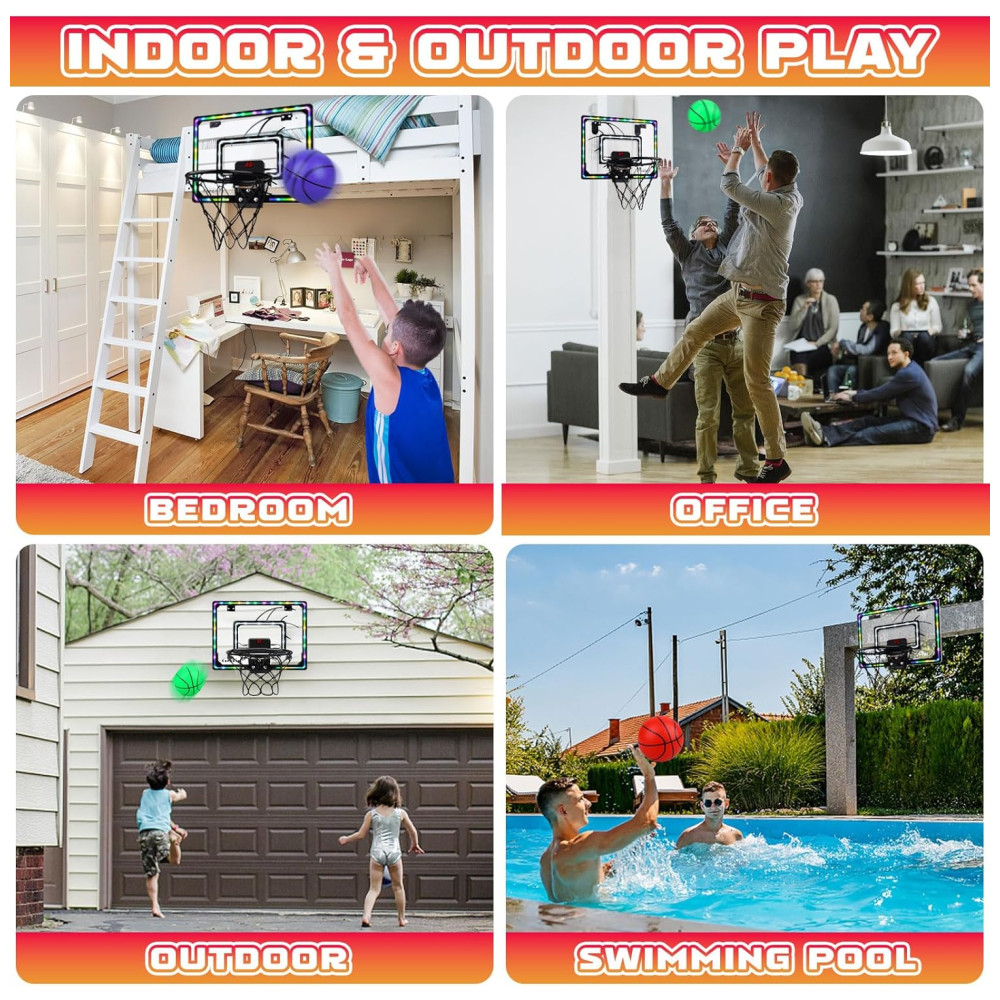 Pontuação Eletrônica e Luzes Legais: Esta cesta de basquete interna vem com pontuação eletrônica e som de torcida. Cada gol será comemorado com pontos contados e torcidas. Molduras internas e externas legais com luzes LED de arco-íris tornam suas enterradas mais impactantes visualmente, trazendo a competição do jogo para sua casa! A mini cesta de basquete não só traz diversão para as crianças, mas também oferece um momento de relaxamento para os adultos no trabalho.