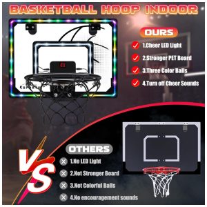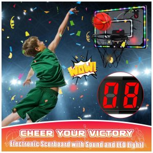 Pontuação Eletrônica e Luzes Legais: Esta cesta de basquete interna vem com pontuação eletrônica e som de torcida. Cada gol será comemorado com pontos contados e torcidas. Molduras internas e externas legais com luzes LED de arco-íris tornam suas enterradas mais impactantes visualmente, trazendo a competição do jogo para sua casa! A mini cesta de basquete não só traz diversão para as crianças, mas também oferece um momento de relaxamento para os adultos no trabalho.