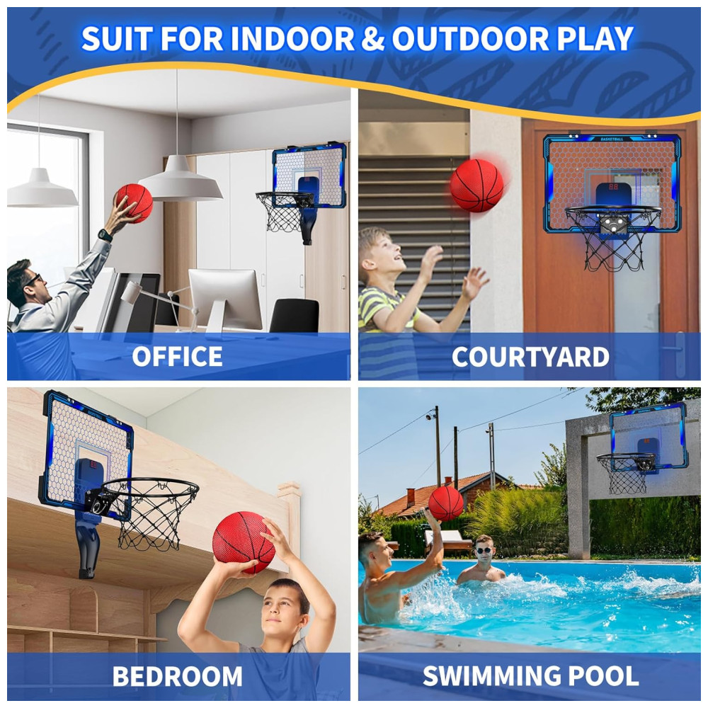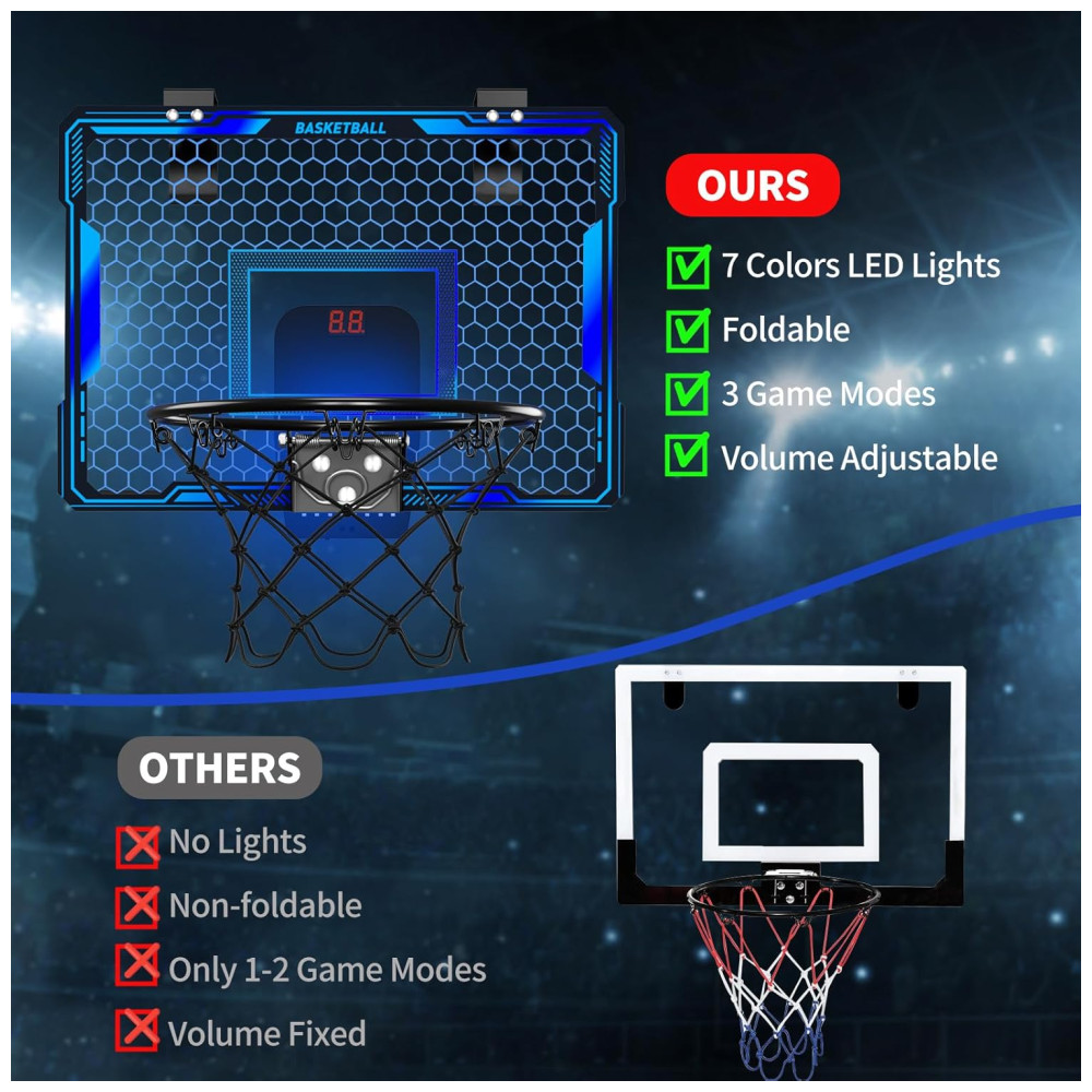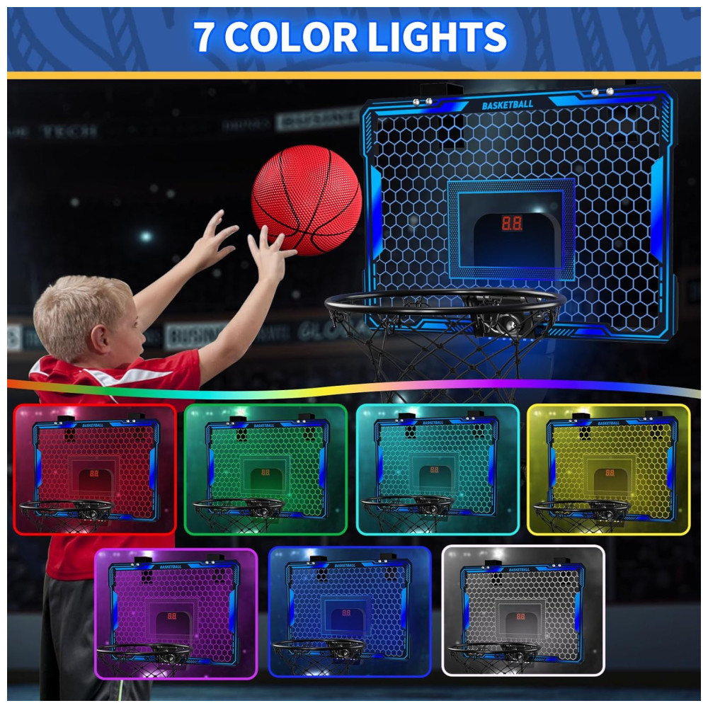 Luzes LED de 7 cores: Nossa cesta de basquete indoor com pontuação automática é equipada com luzes LED de 7 cores, tornando as enterradas ainda mais emocionantes e visuais. A cada gol marcado, a cesta celebra com sons de torcida, tornando o jogo ainda mais divertido e dinâmico!
