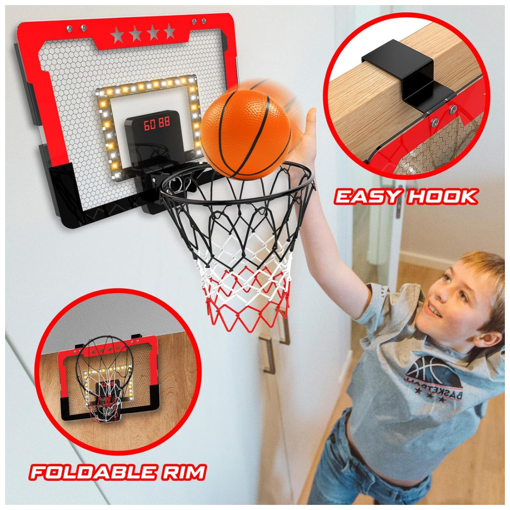 Esta mini cesta de basquete vem equipada com duas telas eletrônicas: um cronômetro à esquerda e um contador de pontos à direita, que calculam e exibem automaticamente a pontuação de forma digital. Cada vez que um gol é marcado, você é recompensado com um som alegre e luzes LED piscantes, celebrando a pontuação. É a combinação perfeita de diversão para crianças e relaxamento para adultos, tornando-se um jogo ideal para uma pausa divertida durante o trabalho ou a rotina diária.