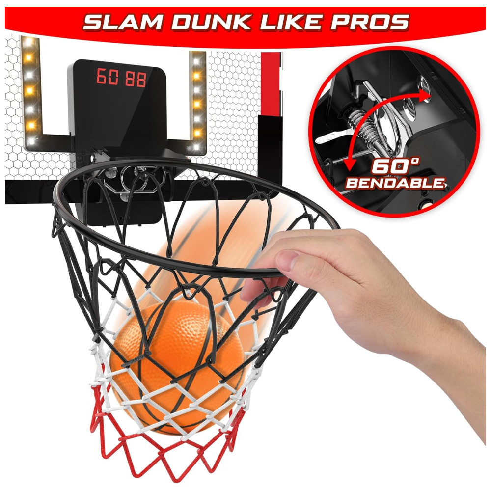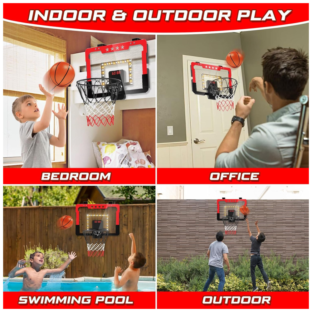 Alta Qualidade e Durabilidade: Feita para resistir a jogadas intensas, esta mini cesta de basquete tem uma borda de aço resistente, um painel traseiro à prova de quebra e uma rede de bola durável. As tiras espessas de esponja à prova de choque no painel ajudam a proteger a porta de arranhões e a reduzir o ruído, garantindo uma experiência silenciosa e sem danos. O conjunto inclui 3 bolas de basquete de borracha, uma bolsa de armazenamento e 50 adesivos DIY para personalizar, além de um controle remoto para reiniciar a pontuação. Tudo isso faz da cesta uma opção perfeita para jogar tanto em ambientes internos quanto externos.