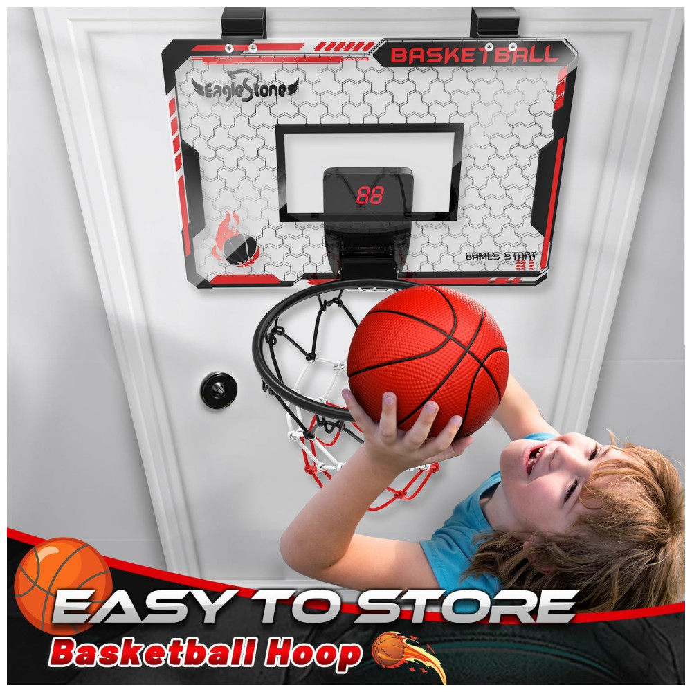 Placar eletrônico com som: Esta mini cesta de basquete para uso interno vem com um placar eletrônico que torna o jogo ainda mais divertido, rastreando as pontuações e tocando sons de torcida animados. Além de estimular o amor pela atividade física, ela ajuda as crianças a desenvolver habilidades motoras essenciais, como rastreamento visual e coordenação olho-mão. Ideal para crianças de 5 a 7 anos e de 7 a 12 anos, é o presente perfeito para meninos e meninas.
