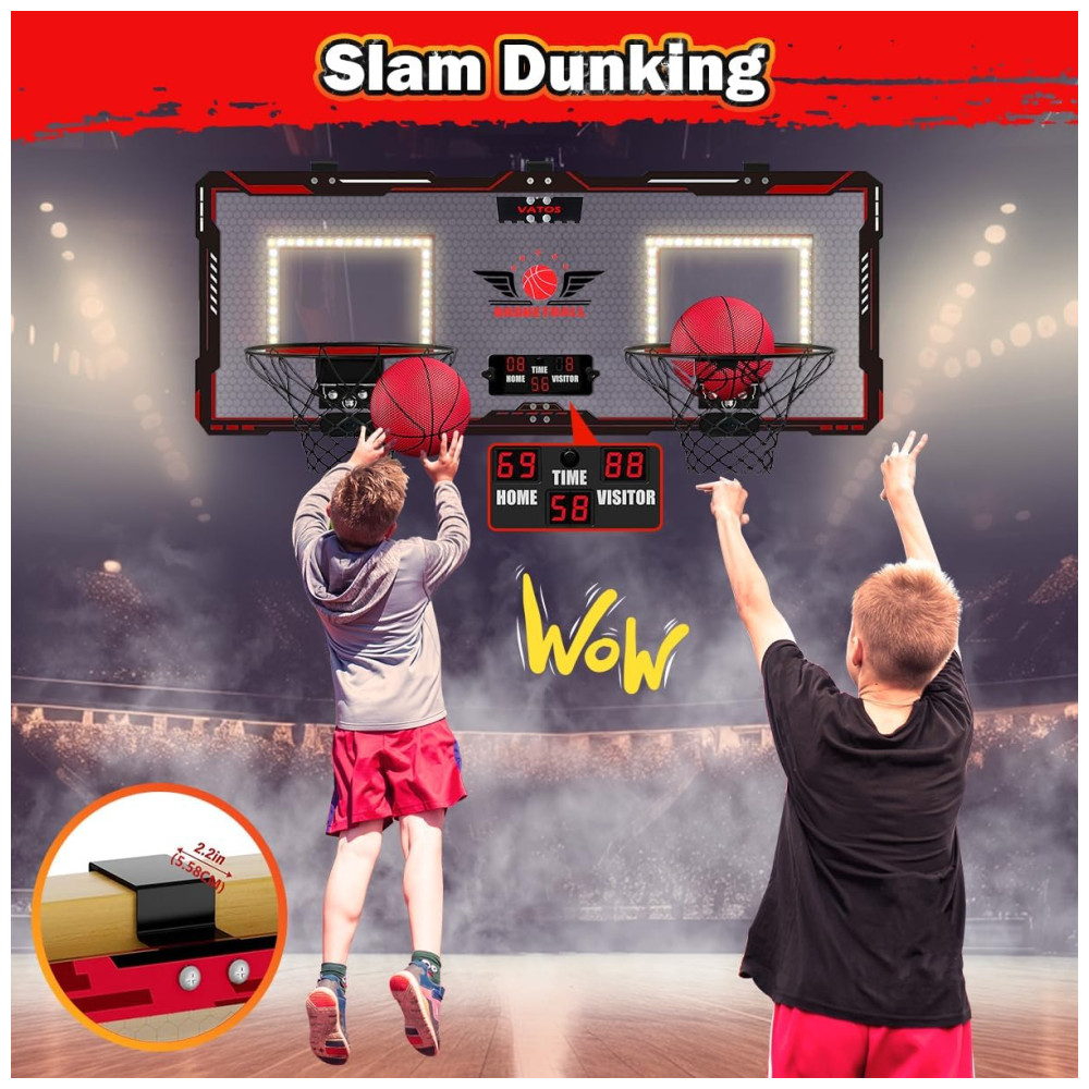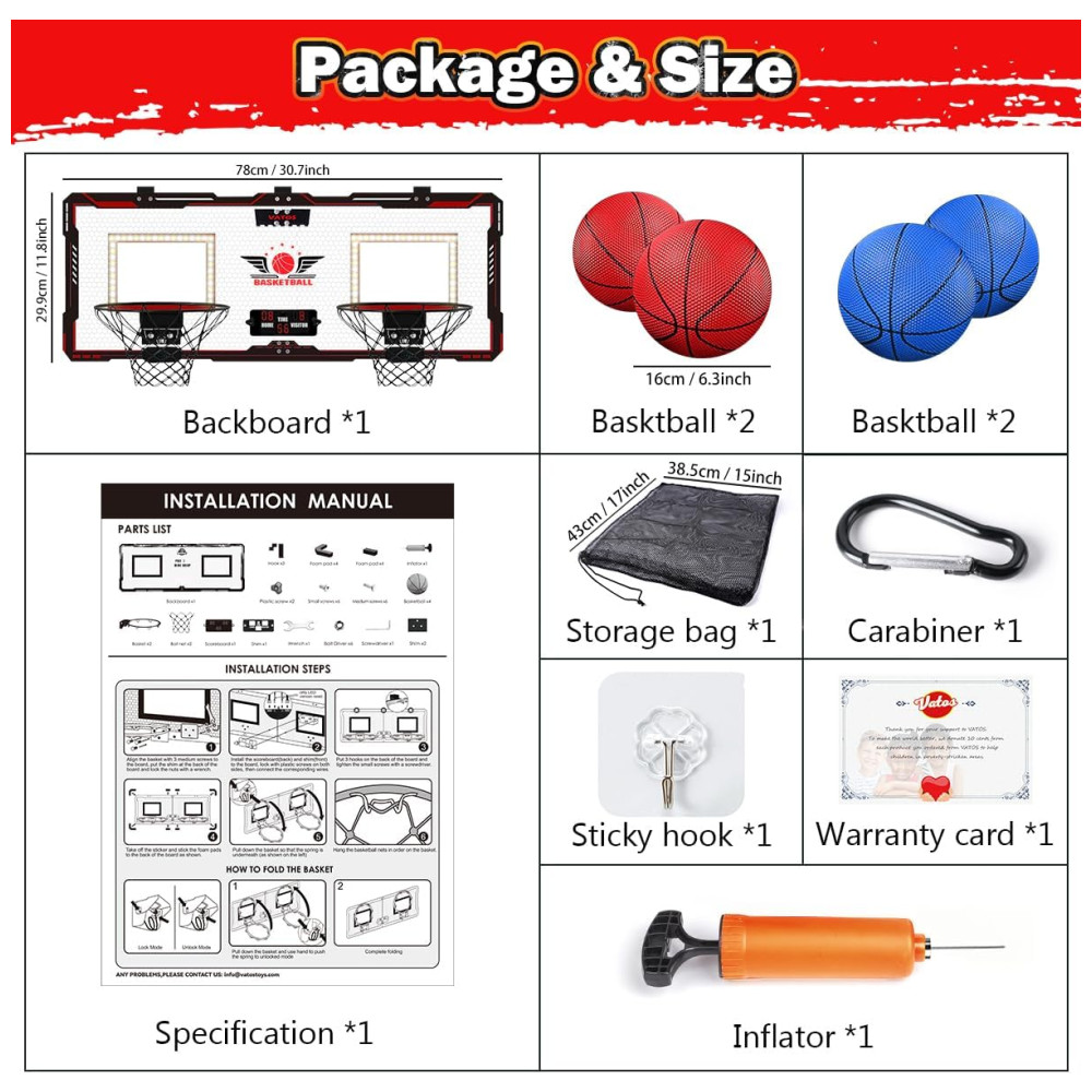 Cesta de Basquete Dupla Interna para 2 Jogadores com Placar Eletrônico 4 Bolas e Bomba de Ar Incluída VATOS Preta e Vermelho