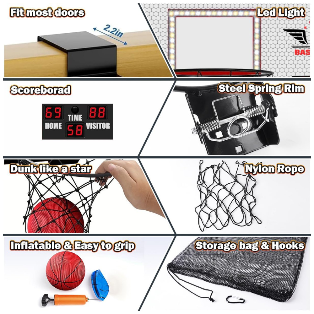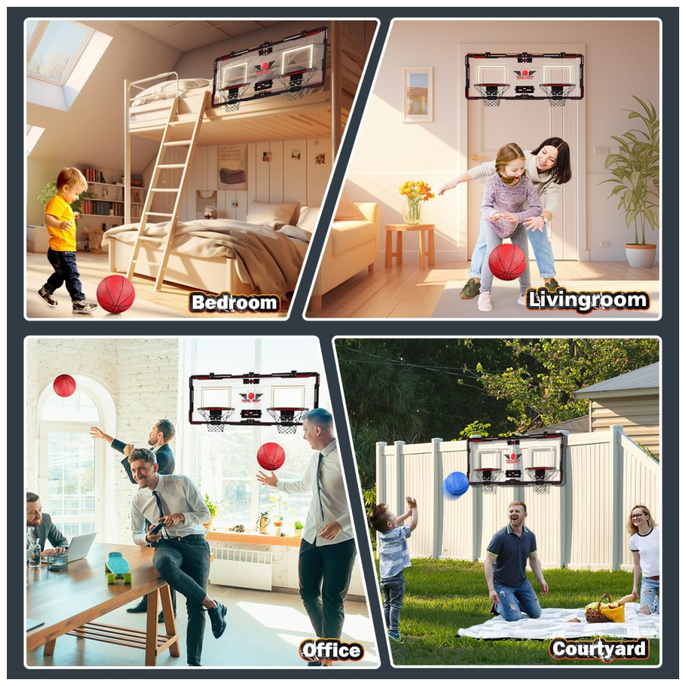 Aro de Basquete Premium para Crianças: O painel de basquete, montado na porta, é feito de policarbonato transparente de alta qualidade, resistente e à prova de quebras. Equipado com aro de aço com mola, bolas de borracha duráveis e redes de alta resistência, o conjunto se adapta a todas as portas de tamanho padrão, oferecendo uma experiência de basquete autêntica e de alta qualidade.