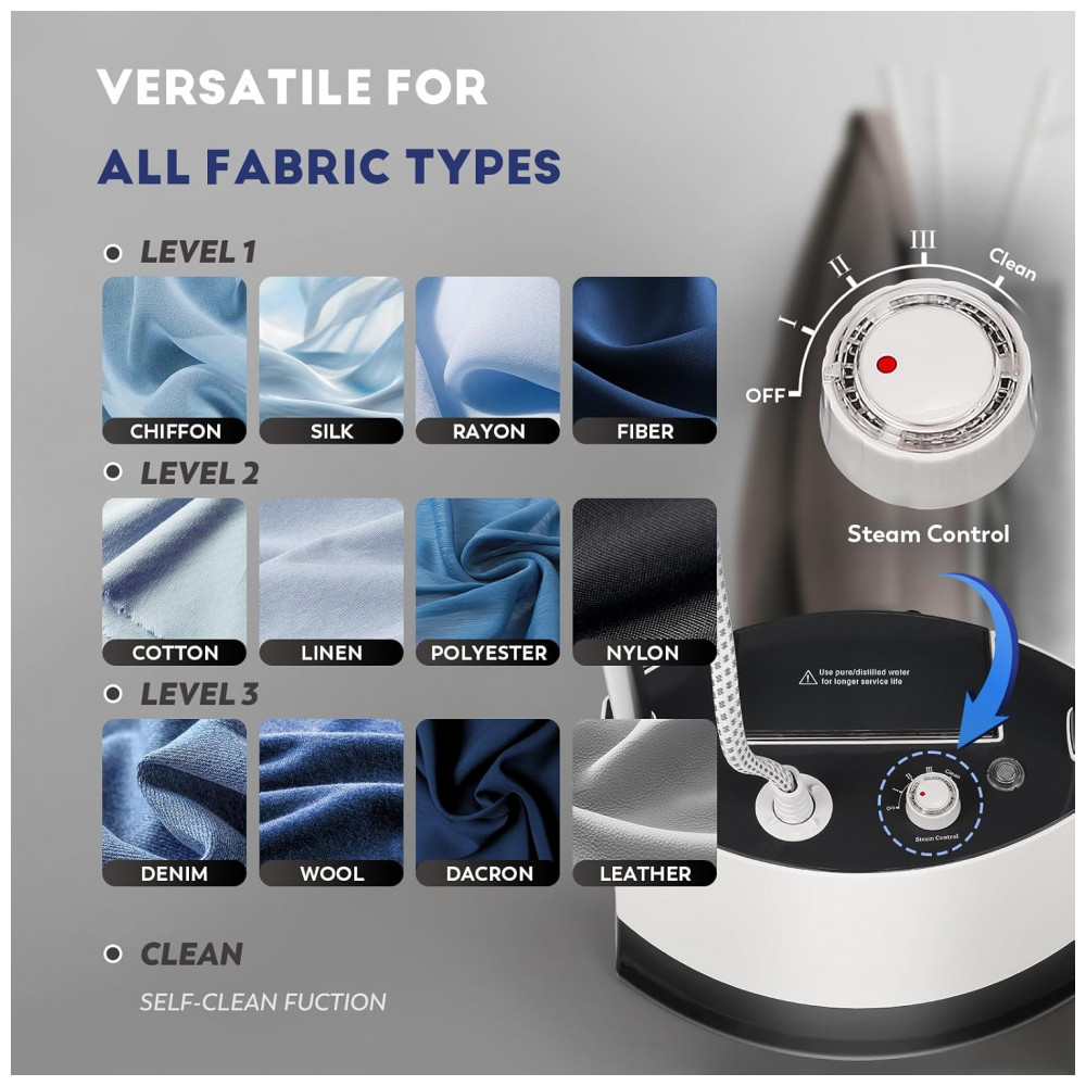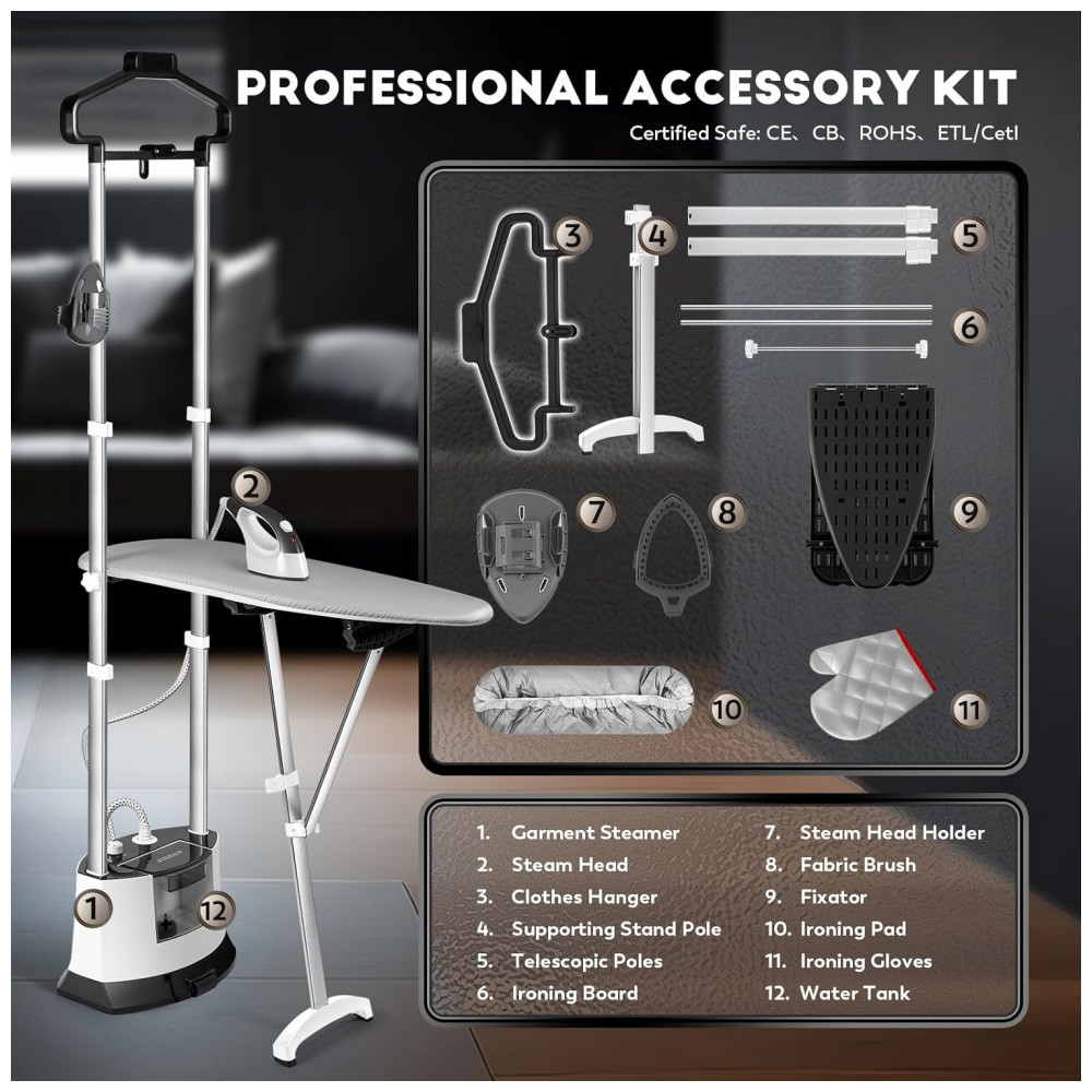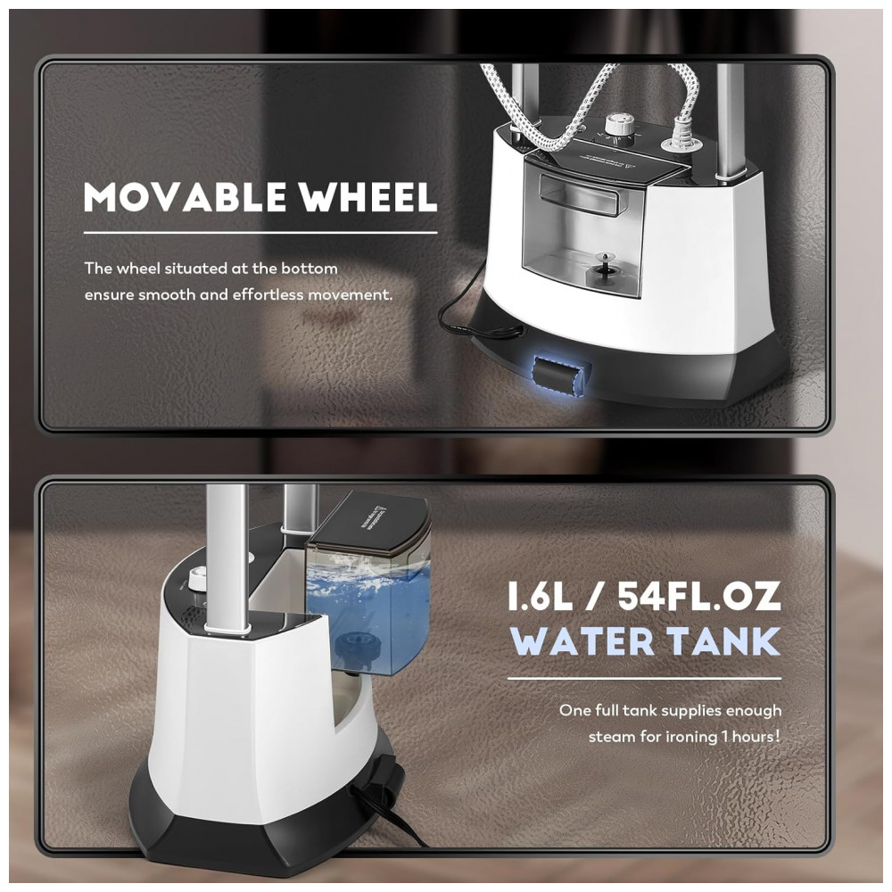 O Vaporizador de Roupas CGOLDENWALL oferece a capacidade de passar a ferro tanto pendurado quanto plano, atendendo a todas as necessidades de cuidados com roupas. Com um poste telescópico, tábua de passar, cabide de roupas, você pode alternar facilmente entre os métodos para uma experiência de passar a ferro sem complicações. Personalize a intensidade do vapor em três níveis para se adequar a qualquer tipo de tecido. Este poderoso vaporizador de roupas enfrenta eficientemente rugas em camisas, jeans, casacos, ternos, cortinas, tecidos de mesa, capas de móveis e colchões. O tanque de água espaçoso e transparente garante vapor contínuo por até 60 minutos, com monitoramento e recarga fáceis. As rodas embutidas na base facilitam o movimento do vaporizador. Desfrute de recursos de auto-limpeza automática e proteção contra superaquecimento. O vaporizador desliga automaticamente quando o tanque está vazio, garantindo a segurança da máquina. Equipado com uma pressão ultraforte de 1800W e um pulverizador de isolamento térmico com onze orifícios, o vaporizador garante distribuição eficiente de vapor para remoção rápida de rugas. Certificado com CE, CB, ROHS e ETLCETL, os acessórios atendem aos padrões profissionais de segurança e qualidade, garantindo durabilidade e confiabilidade.