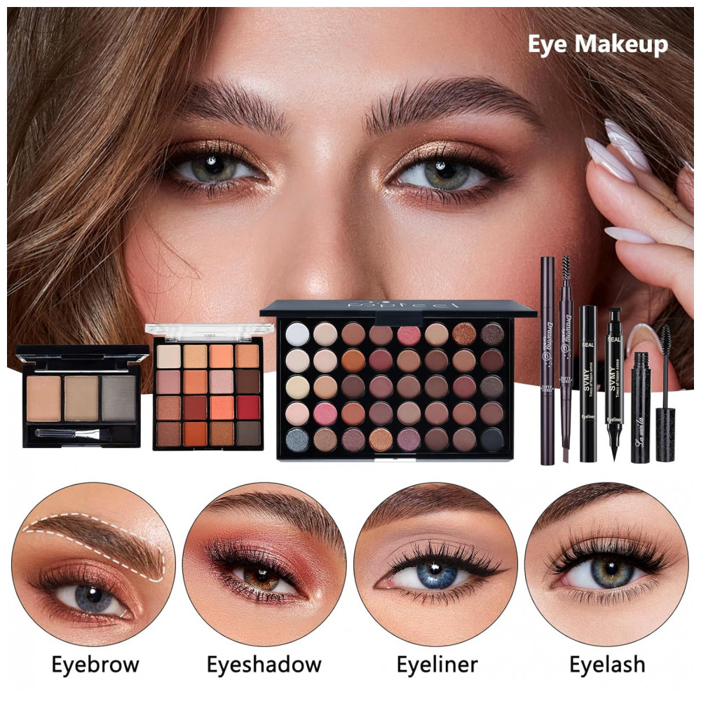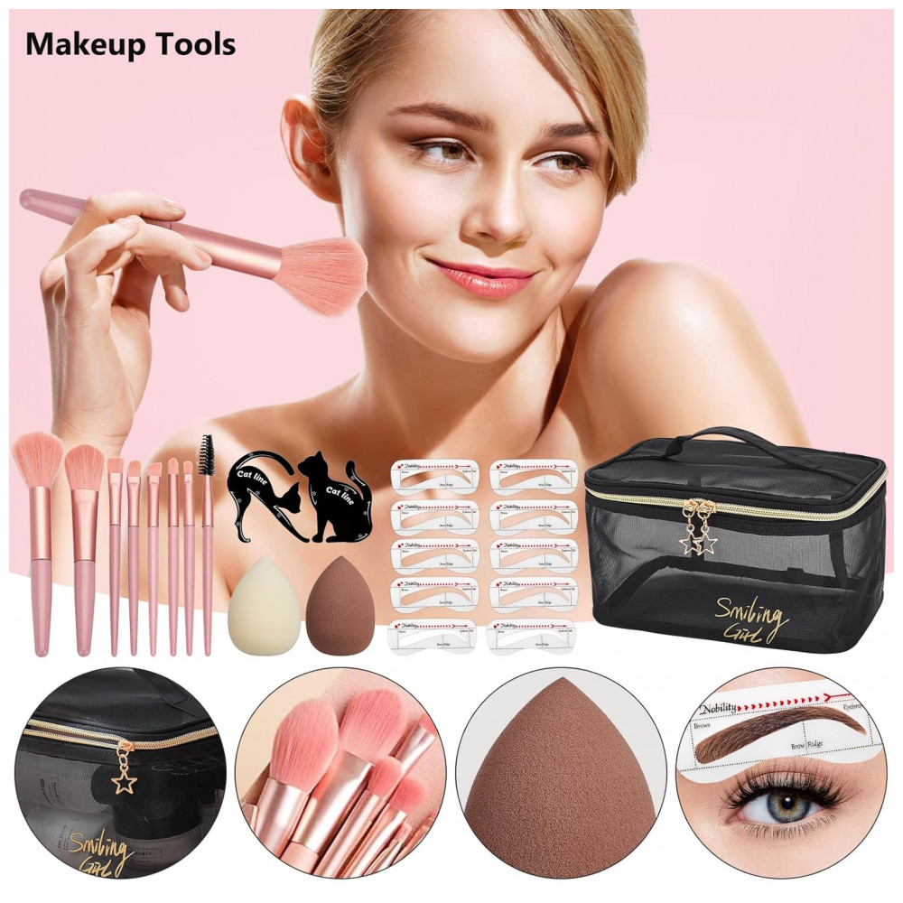 Kit Completo de Maquiagem All in One da CHAFFUL oferece tudo que você precisa para sua rotina diária de beleza: base, primer facial, paleta de sombras, paleta de contorno, paleta de corretivos, gloss labial, batom em gel, pó solto, pó para sobrancelha, esponjas, batons, delineador, estênceis para sobrancelha, rímel, conjunto de pincéis profissionais e uma prática bolsa para transporte. Ideal tanto para iniciantes quanto para entusiastas experientes, este kit atende perfeitamente todas as suas necessidades diárias de maquiagem.