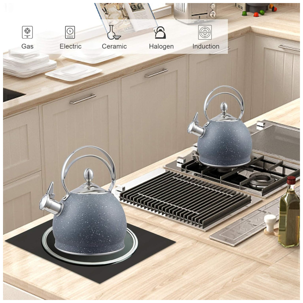 Materiais de alta qualidade Esta chaleira é feita de revestimento antiferrugem profissional e tecnologia de aço inoxidável, alta temperatura e resistência à corrosão, para garantir o desempenho antiferrugem do bule de chá do fogão. O aço inoxidável de grau alimentício de alta qualidade pode resistir a amassados e arranhões. Bule de chá 100 livre de PFOA, não tóxico e não desbotamento, proporcionando melhor proteção à saúde para sua família.