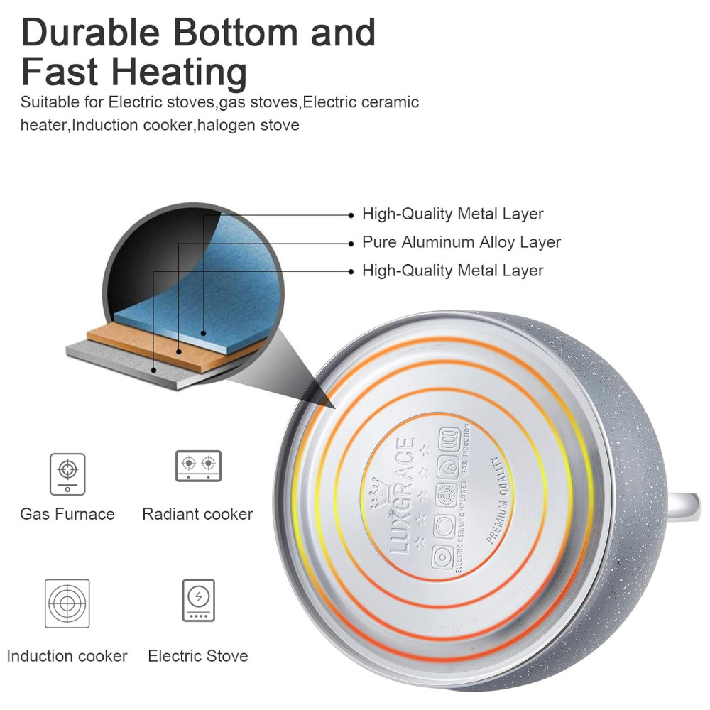 Aplicar a vários fogões Chaleira utilizável para qualquer fonte de calor, incluindo fogão de indução, fogão elétrico, fogão a gás, fogão radiante. Use fogo pequeno ou médio para aquecer o bule, ele aquece muito rápido e economiza energia. Se você encontrar algum problema, entre em contato conosco e nós o ajudaremos a resolver o seu problema