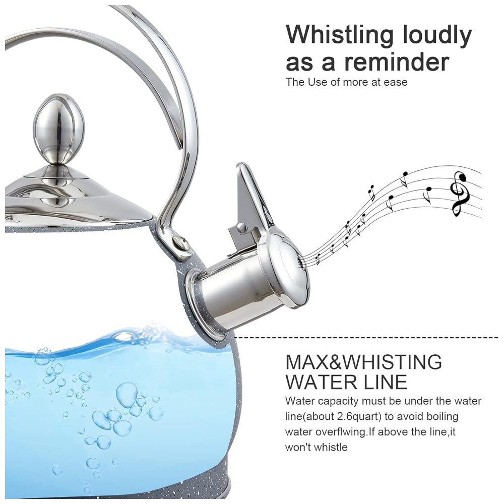 Assobio alto Quando a água está fervendo, a chaleira de assobio emitirá automaticamente um assobio, para que você possa ouvir um assobio alto e único. Quando você está se concentrando em outras questões como tarefas domésticas, assistir TV ou jogos, o apito da chaleira chamará sua atenção. Economiza tempo, é simples e sem estresse.