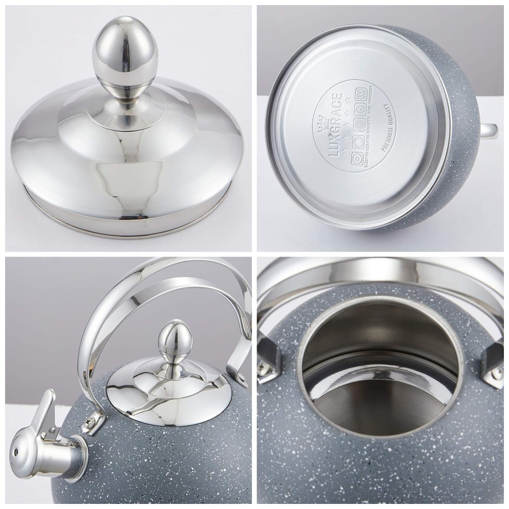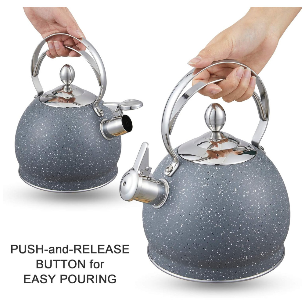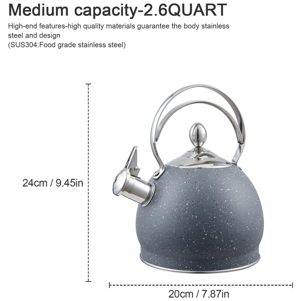 Capacidade adequada. Chaleira de aço inoxidável de 2,5 QT, 2 Litros economiza seu tempo e energia, sendo adequada para uso familiar A abertura maior do bule torna mais fácil encher e limpar o bule de chá do fogão. O design exclusivo do ângulo de abertura da bica pode não apenas abrir a tampa e encher com água, mas também rapidamente encher com água através da bica.