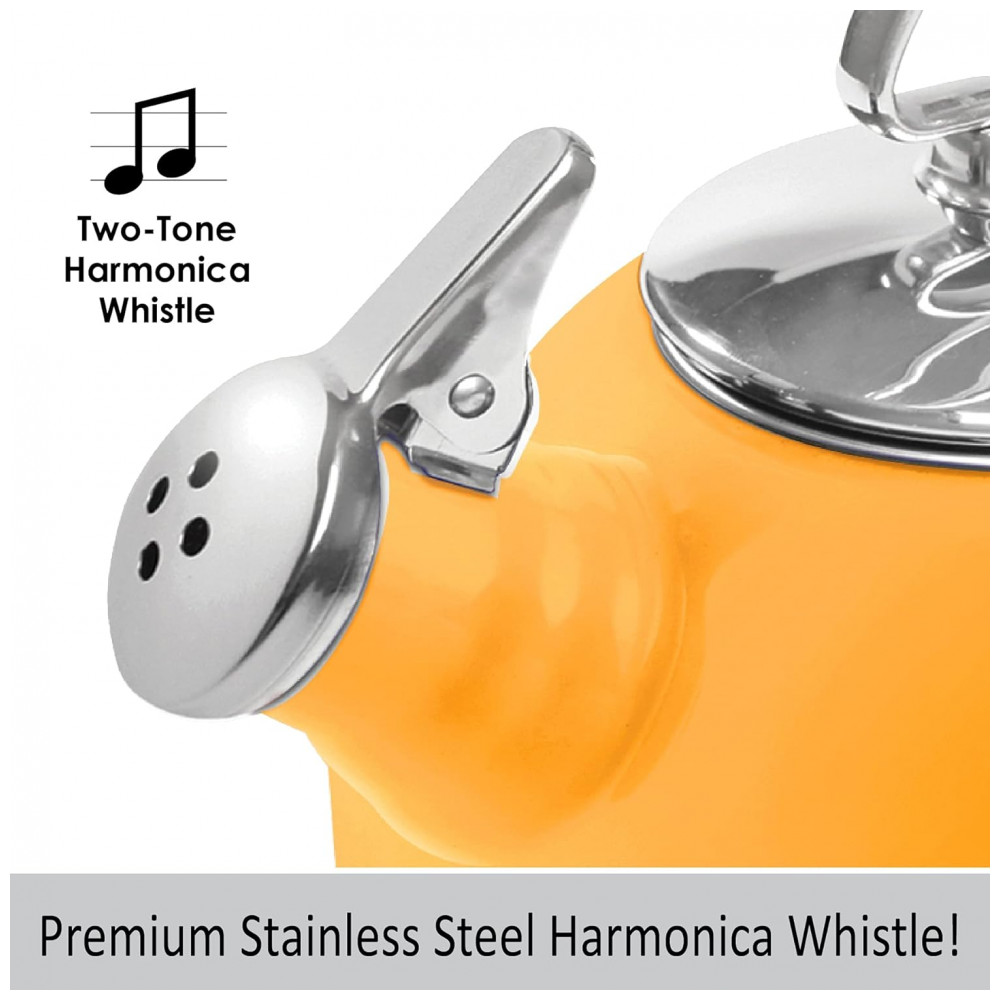HARMONICA WHISTLE A única chaleira com um exclusivo apito de gaita de dois tons, esta chaleira não apenas assobia ela canta O líder mundial de harmônicas, o alemão Hohner, fornece a palheta de harmônica para esta chaleira clássica.