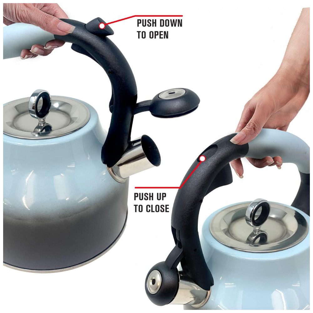 Som de assobio perfeito a chaleira emite um apito alto quando a água atinge o ponto de ebulição. Quando você se concentra em fazer tarefas domésticas, assistir filmes e outras atividades, o bule apita para lembrá lo quando a água está fervendo, você pode ouvi lo de outra sala depois que a água ferve.
