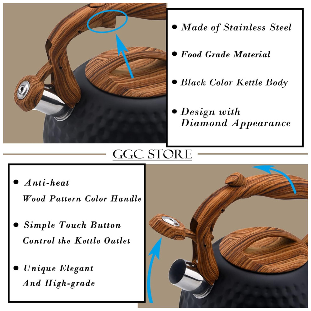 Design de alta qualidade a chaleira GGC é feita de aço inoxidável pesado, corpo da chaleira de cor preta, design com aparência de diamante e alça de cor de padrão de madeira, tornando sua chaleira mais exclusiva, elegante e de alta qualidade.