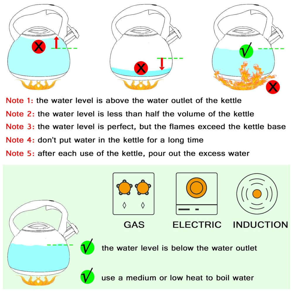 Aplique a vários fogões a chaleira de aço inoxidável adequada para todos os tipos de fogão, como fogão de indução, forno elétrico, fogão a gás e gás natural. Ao usar um fogão a gás, use um fogo baixo ou médio para aquecer a chaleira para evitar que a chama queime o bico ou descolora o corpo da chaleira