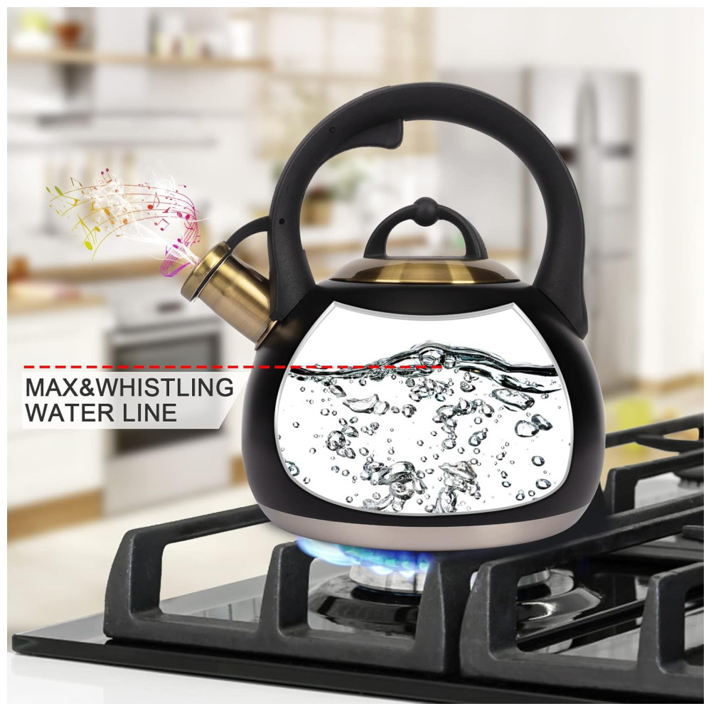 Som de assobio perfeito da chaleira esta chaleira para fogão tem uma tampa bem ajustada que mantém o vapor na chaleira quente para um aquecimento rápido e apitos agradáveis quando a água ferve, alto o suficiente para alertá lo quando você estiver ocupado no próxima sala.