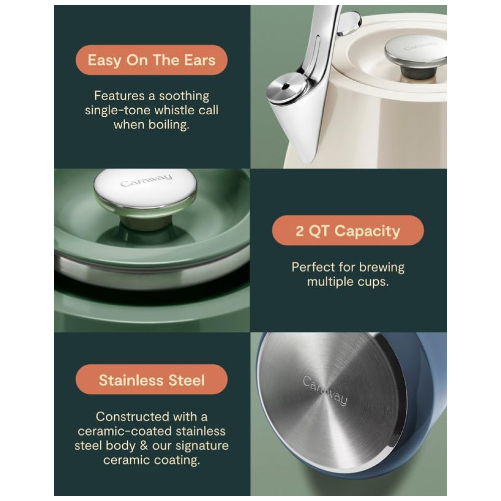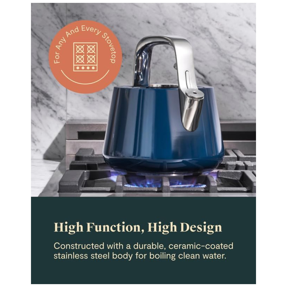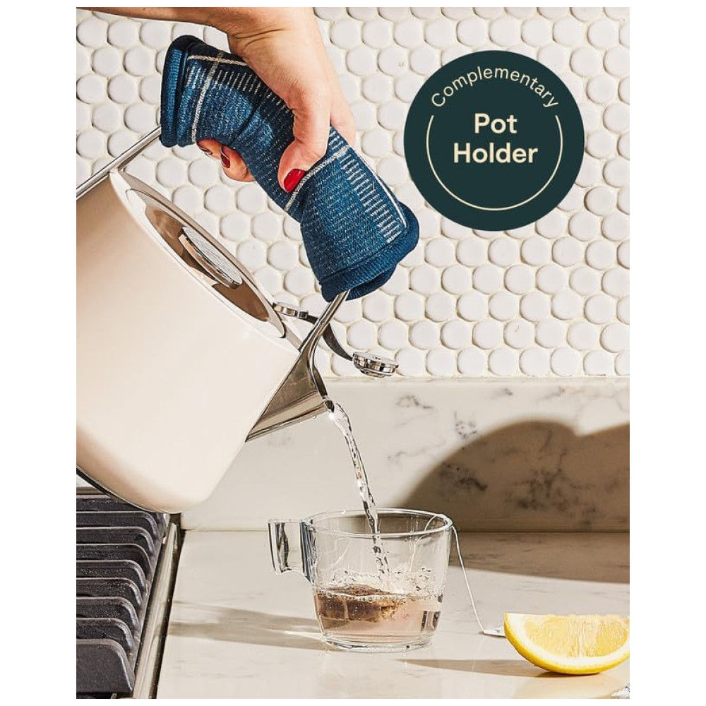 STOVETOP AGNOSTIC Projetado para fervura rápida, cada chaleira de chá de 2 litros é construída com um corpo de aço inoxidável e revestida em cerâmica não tóxica. Pode ser em qualquer tipo de fogão, incluindo indução, gás e elétrico.