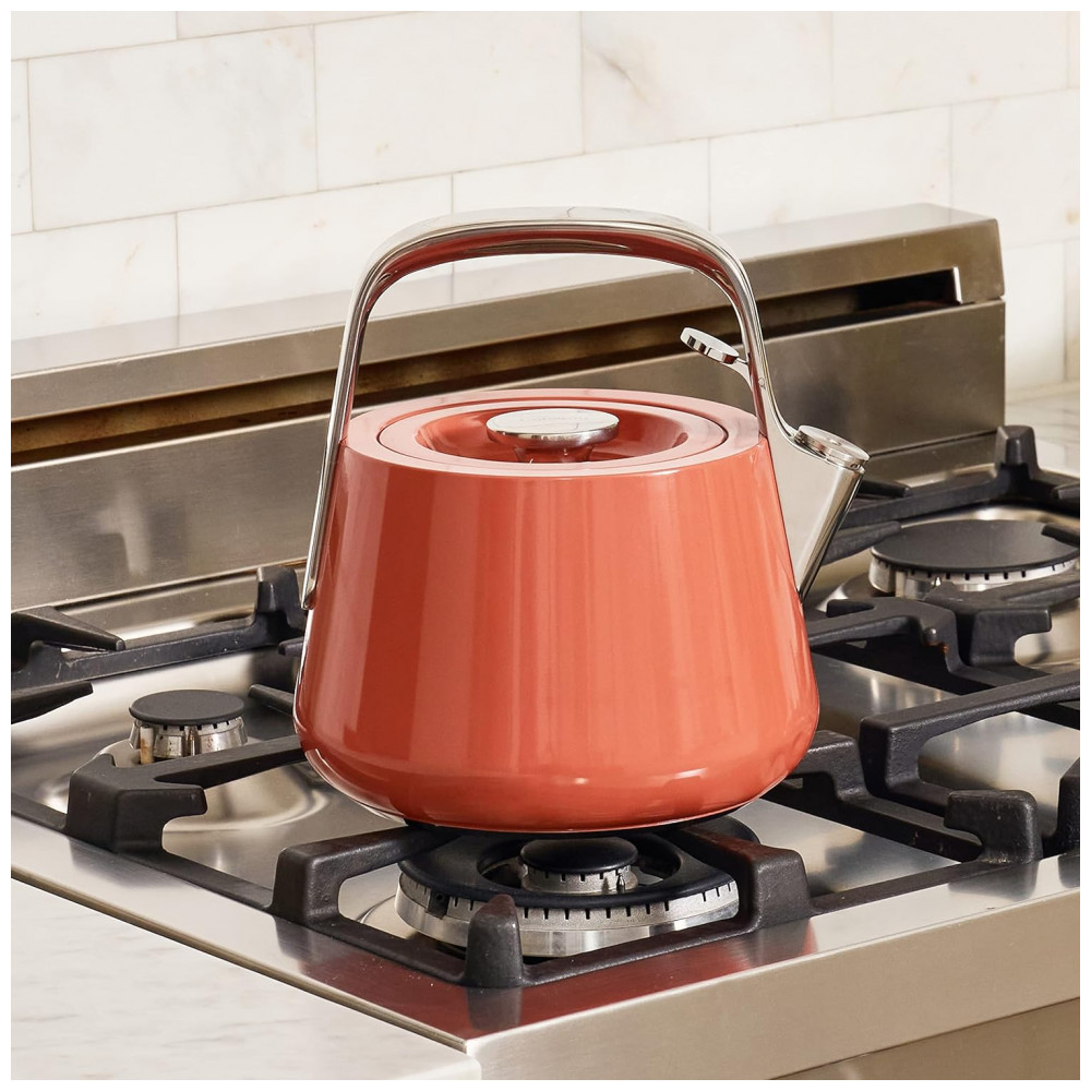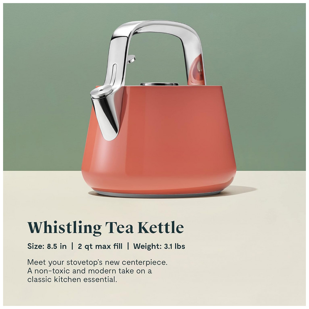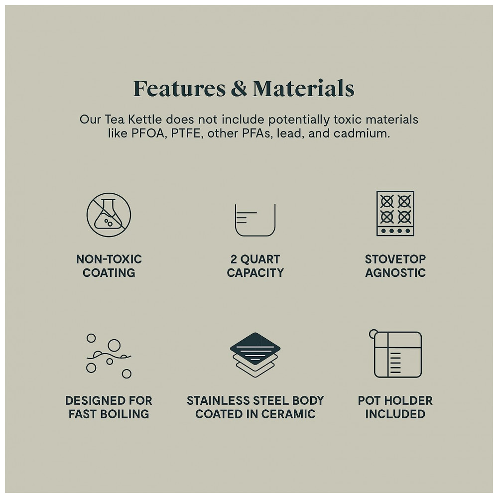 STOVETOP AGNOSTIC Projetado para fervura rápida, cada chaleira de chá de 2 litros é construída com um corpo de aço inoxidável e revestida em cerâmica não tóxica. Pode ser em qualquer tipo de fogão, incluindo indução, gás e elétrico.