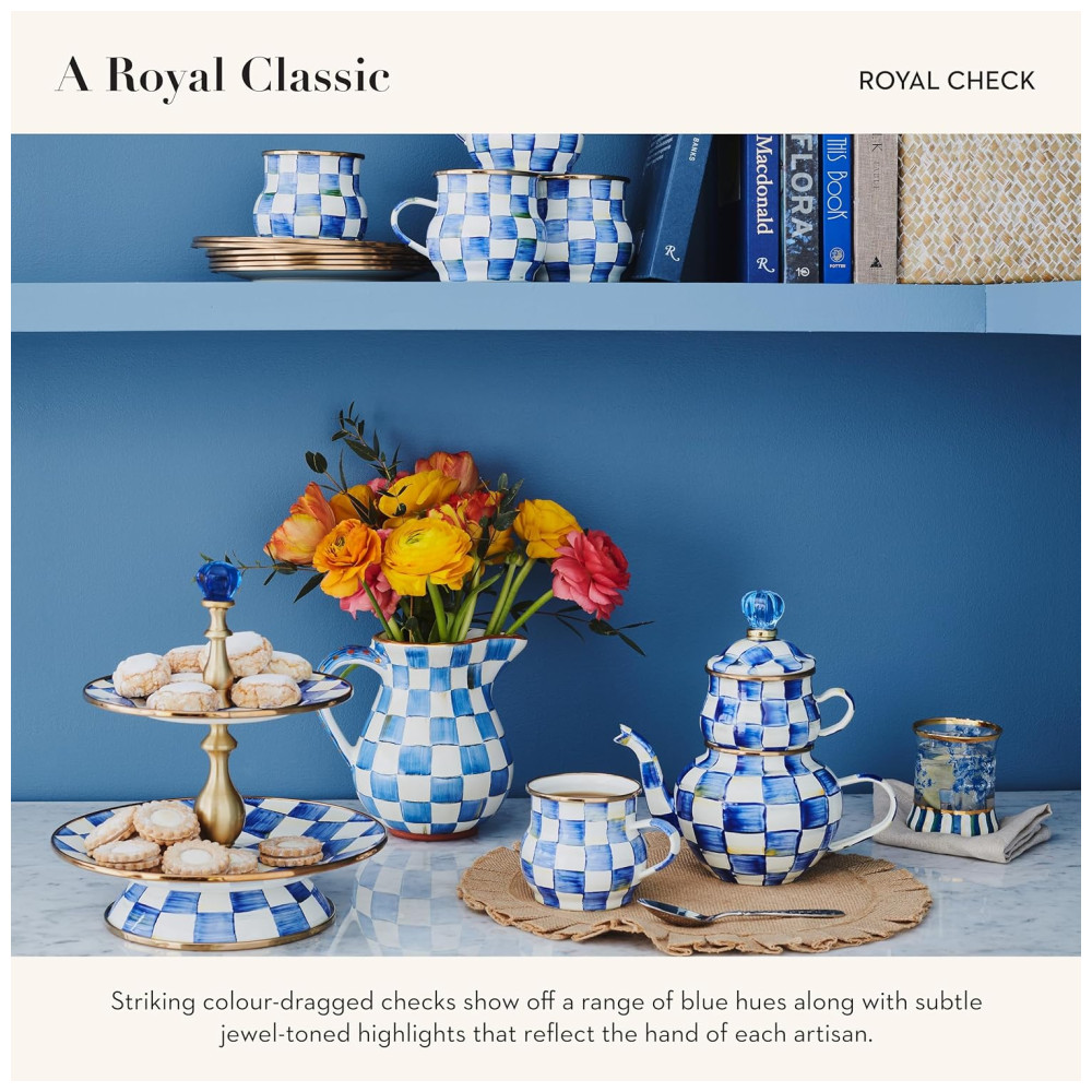 CHALEIRA ROYAL CHECK Esta chaleira quadriculada tem uma parte inferior de aço de calibre pesado vidrada com cheques coloridos pintados à mão em uma variedade de tons de azul. Com uma alça de madeira e uma tampa encimada por um elegante puxador de vidro azul, ela está vestida com esmero