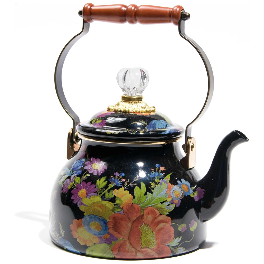 FLOWER MARKET TEA KETTLE Esta chaleira floral tem uma parte inferior de aço de calibre pesado envidraçada com tons de jardim exantes e decorada à mão com decalques botânicos. Com uma alça de madeira e um lindo tampo de vidro, esta chaleira de fogão está vestida com esmero.