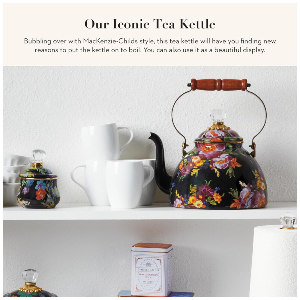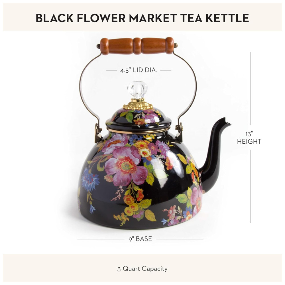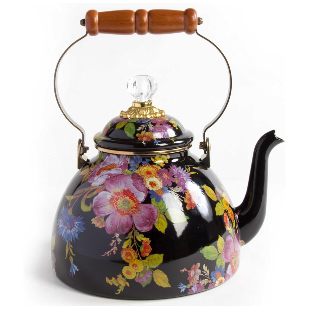 FLOWER MARKET TEA KETTLE Esta chaleira floral tem uma parte inferior de aço de calibre pesado envidraçada com tons de jardim exantes e decorada à mão…