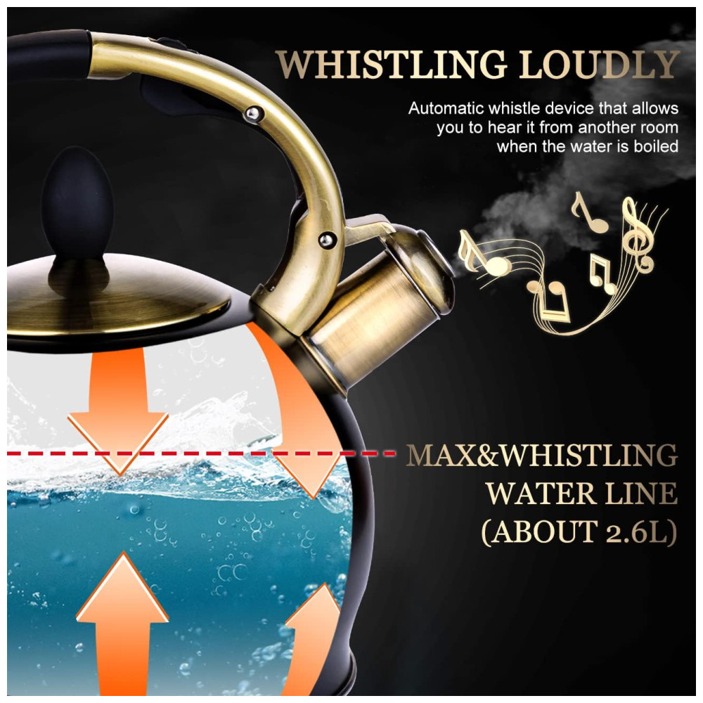 SOM DE ASSOBIO PERFEITO GRANDE CAPACIDADE Faça chá com esta chaleira grande de 2,4 L para toda a sua família. O apito alto garante que você possa ouvi lo de outra sala quando a água estiver fervendo.