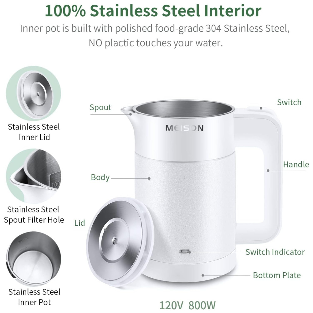 Mini chaleira elétrica para água fervente, 0,6 litro, o sabor mais puro, sem contato de plástico com água quente Ele vem com aço inoxidável 304 de qualidade alimentar Sem risco de ferrugem na panela interna, tampa interna, bico e aro. Nenhum plástico em contato com água quente. Água potável saudável e segura