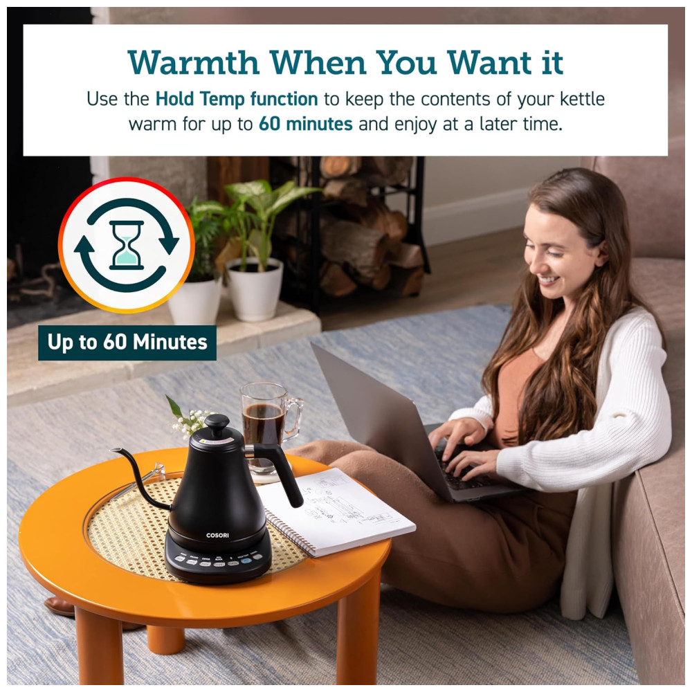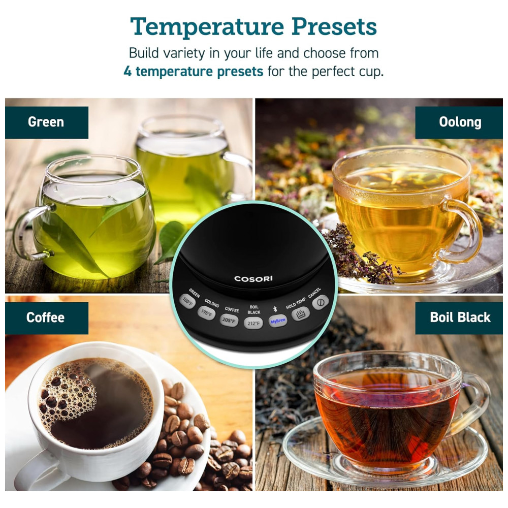 Temperaturas precisas a chaleira de pescoço de ganso Cosori possui 4 predefinições precisas de temperatura, para que o seu chá seja preparado perfeitamente. Também tem uma função de retenção de temperatura que mantém a água na mesma temperatura por 60 minutos
