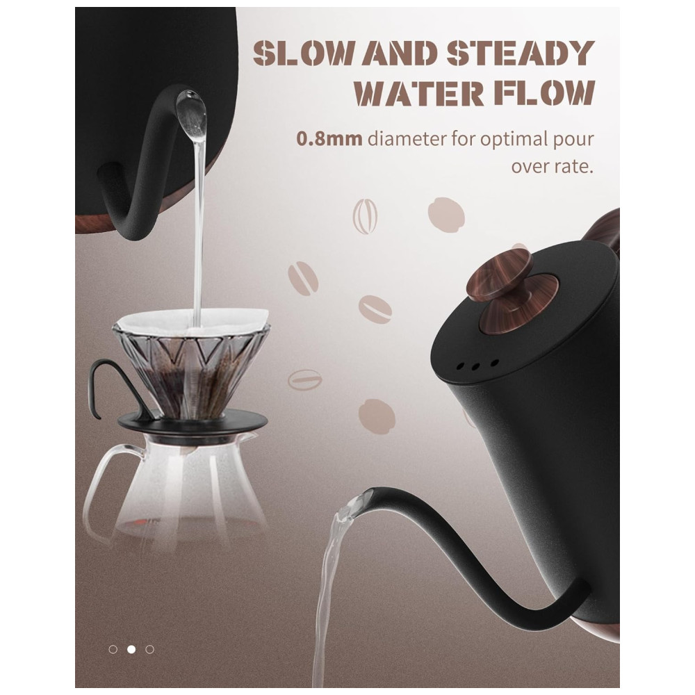 DESIGN ÚNICO E SIMPLES A chaleira de café com bico longo de pescoço de ganso melhora a experiência de preparo, a água sai suavemente, não há necessidade de se preocupar com vazamentos. Concentre se em preparar chá, café, leite em pó e aveia. Deixe esta caldeira de água para derramar torna sua vida mais ritualística.