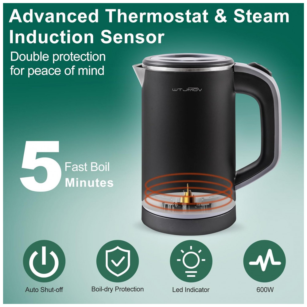 Fast Boil and Energy Save ferva rapidamente em 5 minutos, esta chaleira com 600 watts de menor consumo de energia para economia de energia, perfeita para uso em residências, escritórios, dormitórios e hotéis.