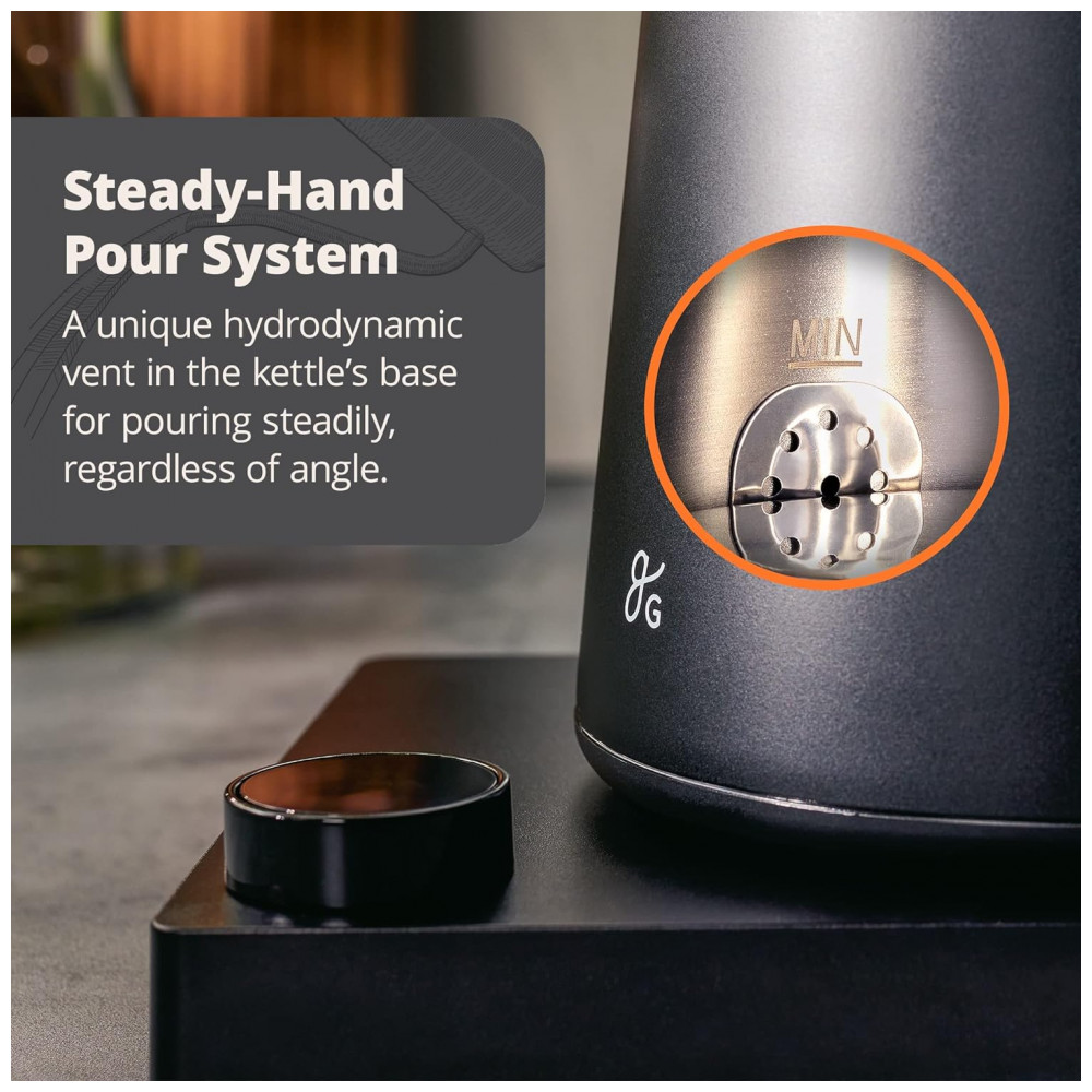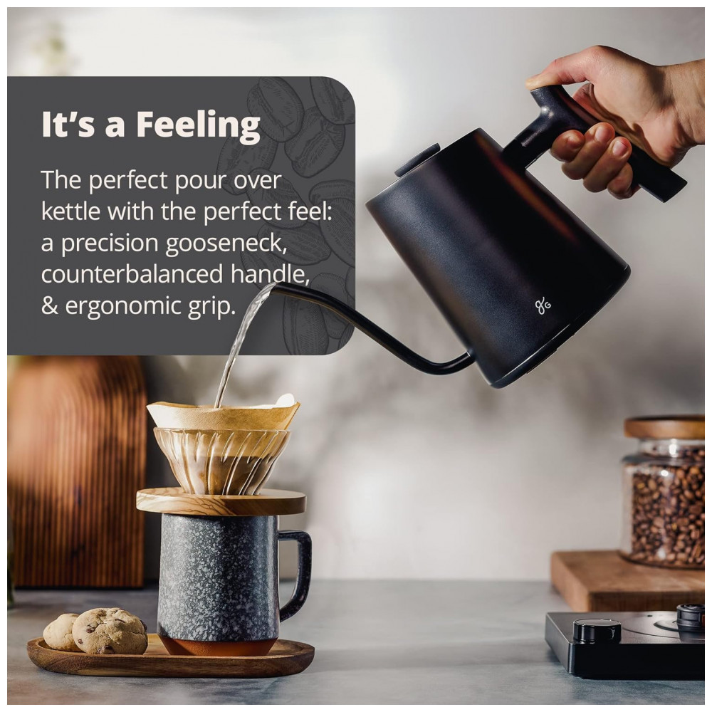 Despeje sobre a perfeição: uma chaleira de café projetada 100 intencionalmente, começando com a alça contrabalançada para o corpo único e sem derramamento para o sistema proprietário de derramamento lento de mão firme até o bico de pescoço de ganso de precisão todas as peças funcionando juntos em direção a uma bela bebida.