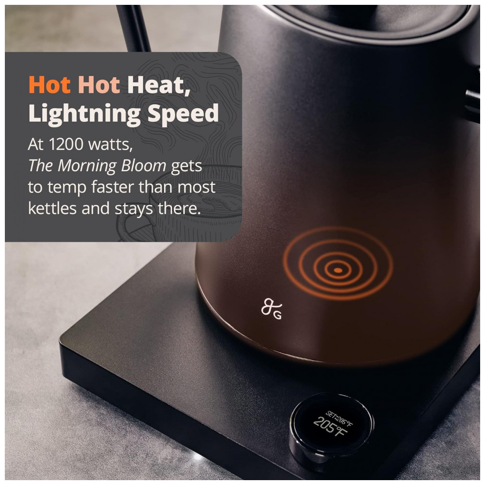 O poder do sol: com 1200 watts, a chaleira gooesneck da Morning Bloom atinge a temperatura desejada em menos de cinco minutos e a mantém por meio de sensores de precisão de ponta.