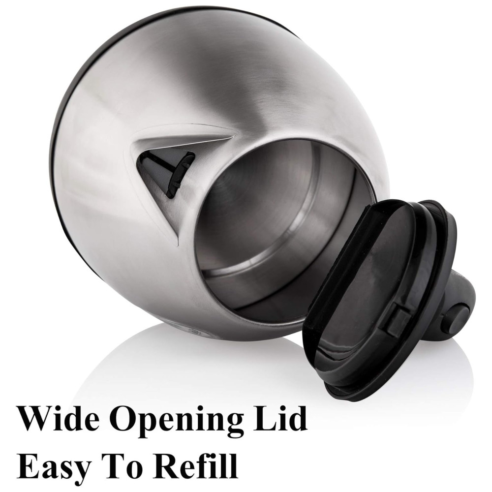 CAPACIDADE E POTÊNCIA EFICAZ A chaleira elétrica tem uma capacidade total de 1,2 litro e se encaixa perfeitamente em qualquer bancada de cozinha. Potência de aquecimento de 1500W com controlador de temperatura fabricado pelo Reino Unido para resultados rápidos leva alguns minutos para ferver com interruptor de um toque 120V 60Hz Está pronto para fazer chá, café, aveia, sopa instantânea ou qualquer outra bebida quente em um piscar de olhos