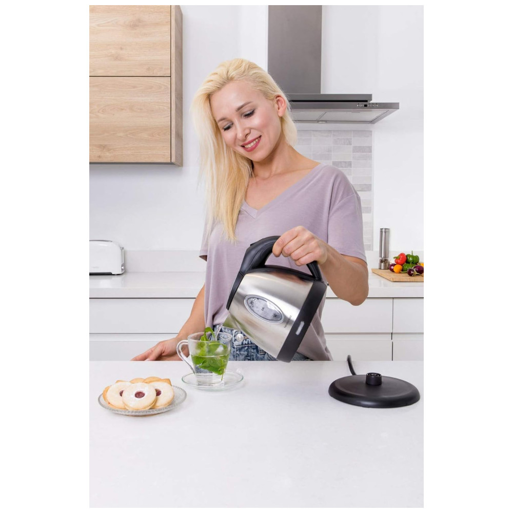 FUNÇÃO DE DESLIGAMENTO AUTOMÁTICO O aquecedor elétrico de água é faturado com desligamento automático com proteção contra fervura para segurança e tranquilidade. O design sem fio permite fácil enchimento e serviço com uma base sem fio rotativa de 360 graus. Filtro removível para limpeza fácil