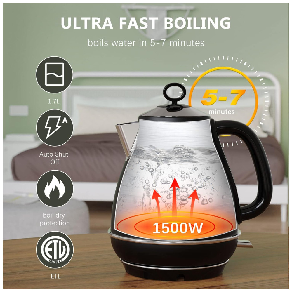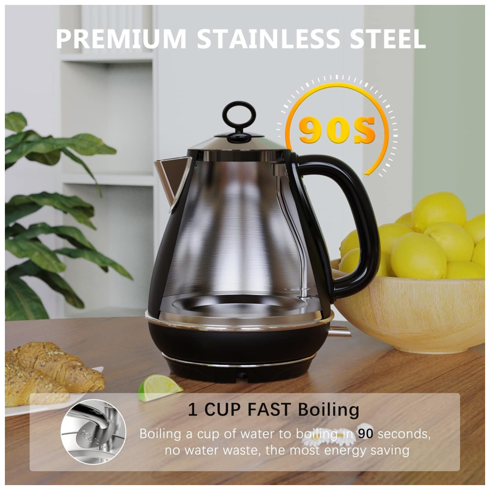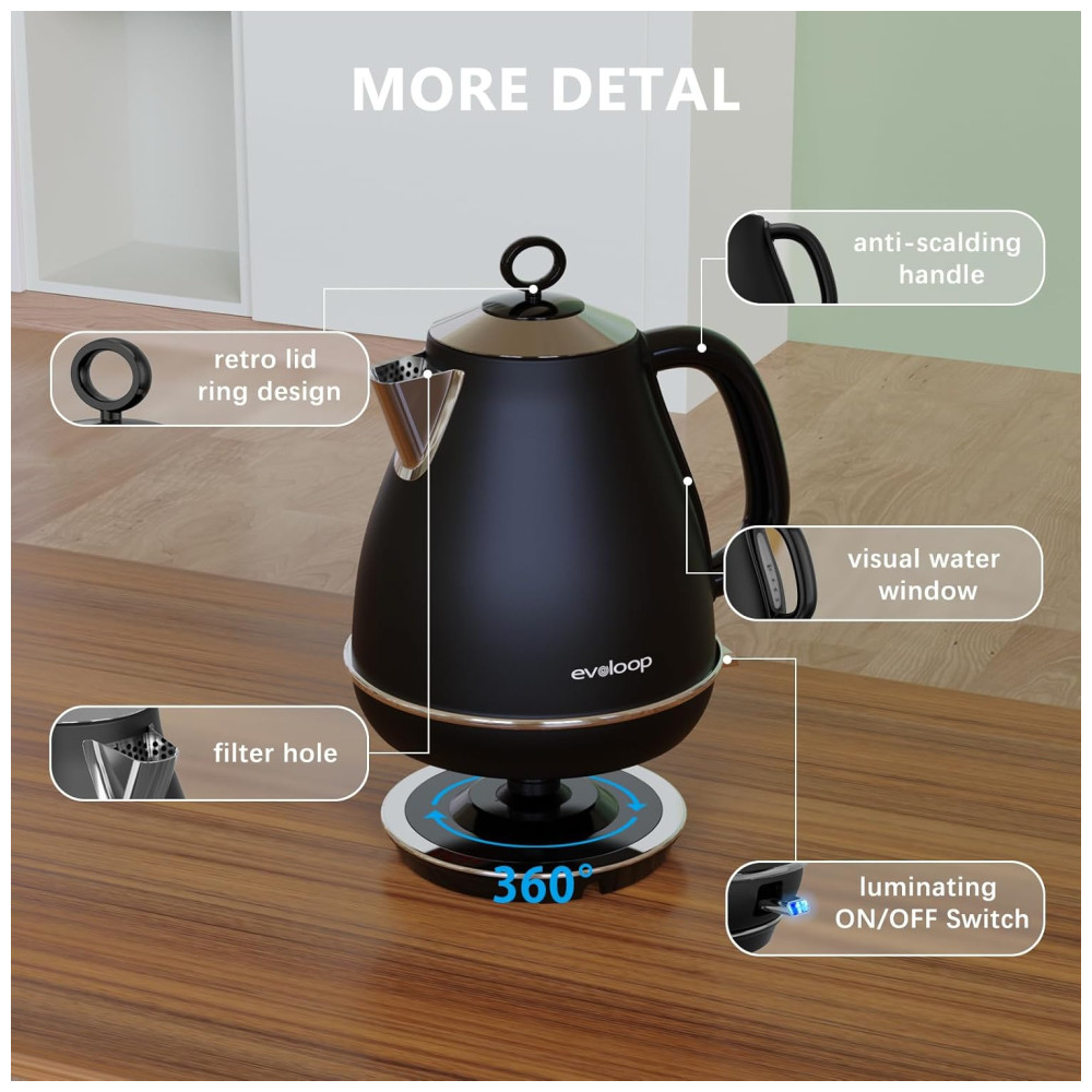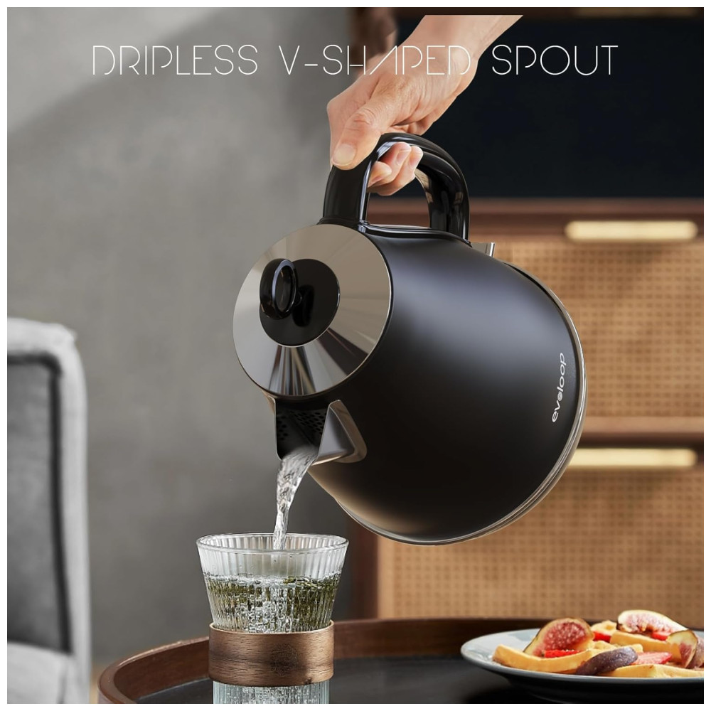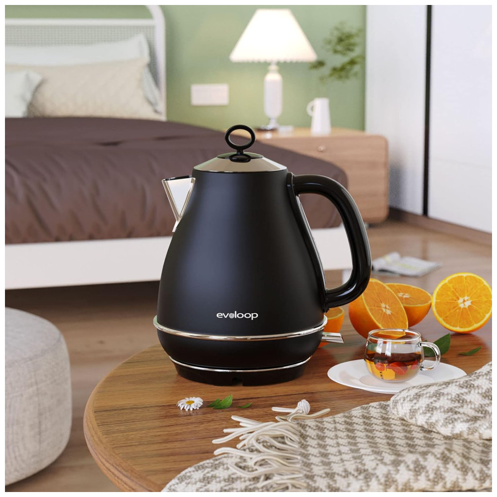As chaleiras elétricas Evoloop com um interruptor de um toque e 1500W de energia de aquecimento produzem resultados rápidos e fervem a água em poucos minutos. Pode preparar rapidamente chá, café, aveia, sopa instantânea ou qualquer outra bebida quente.