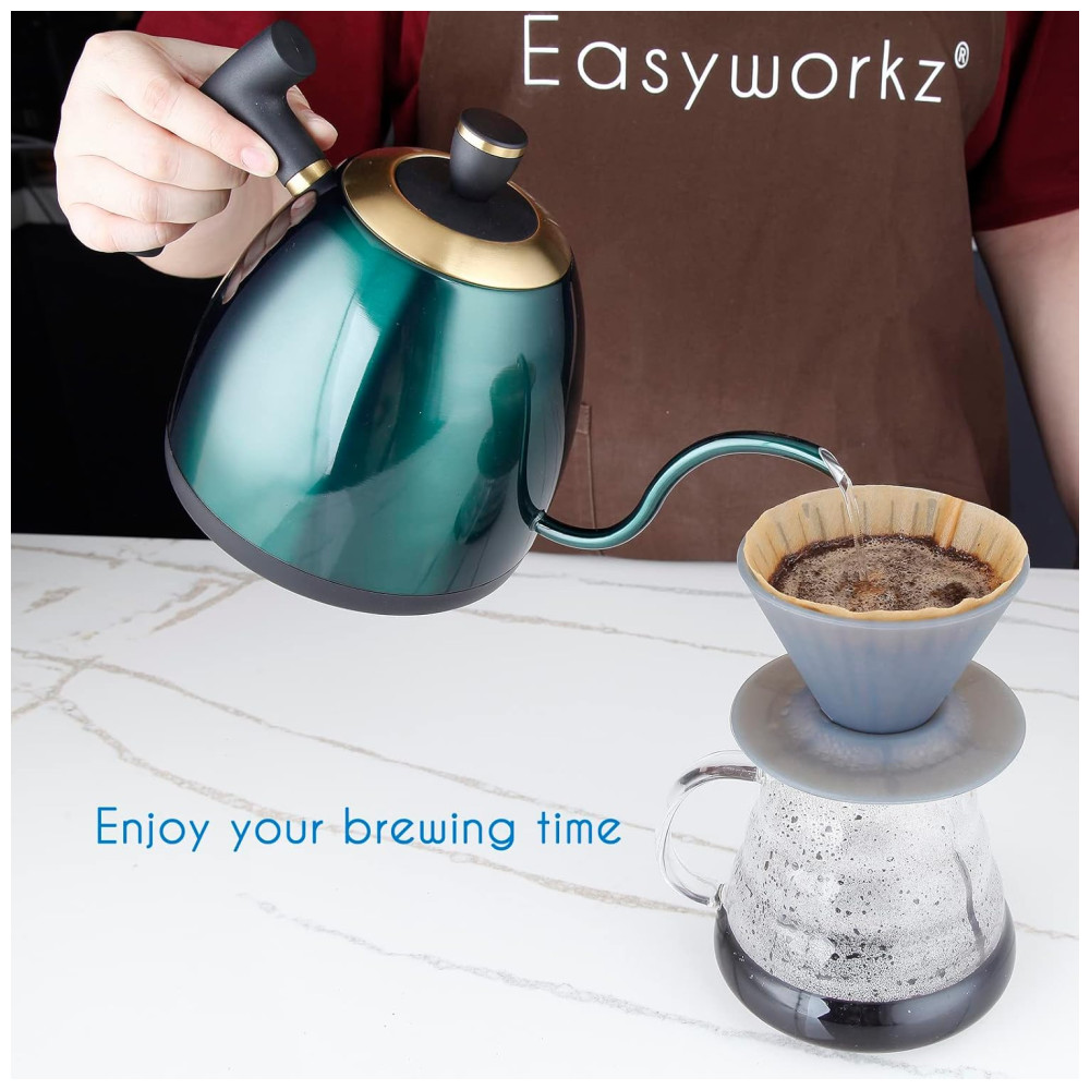 Estética simples e design contemporâneo. A chaleira de pescoço de ganso de aço inoxidável 304 permite que você controle facilmente a velocidade e a consistência do fluxo de água para um ótimo derramamento sobre a preparação.
