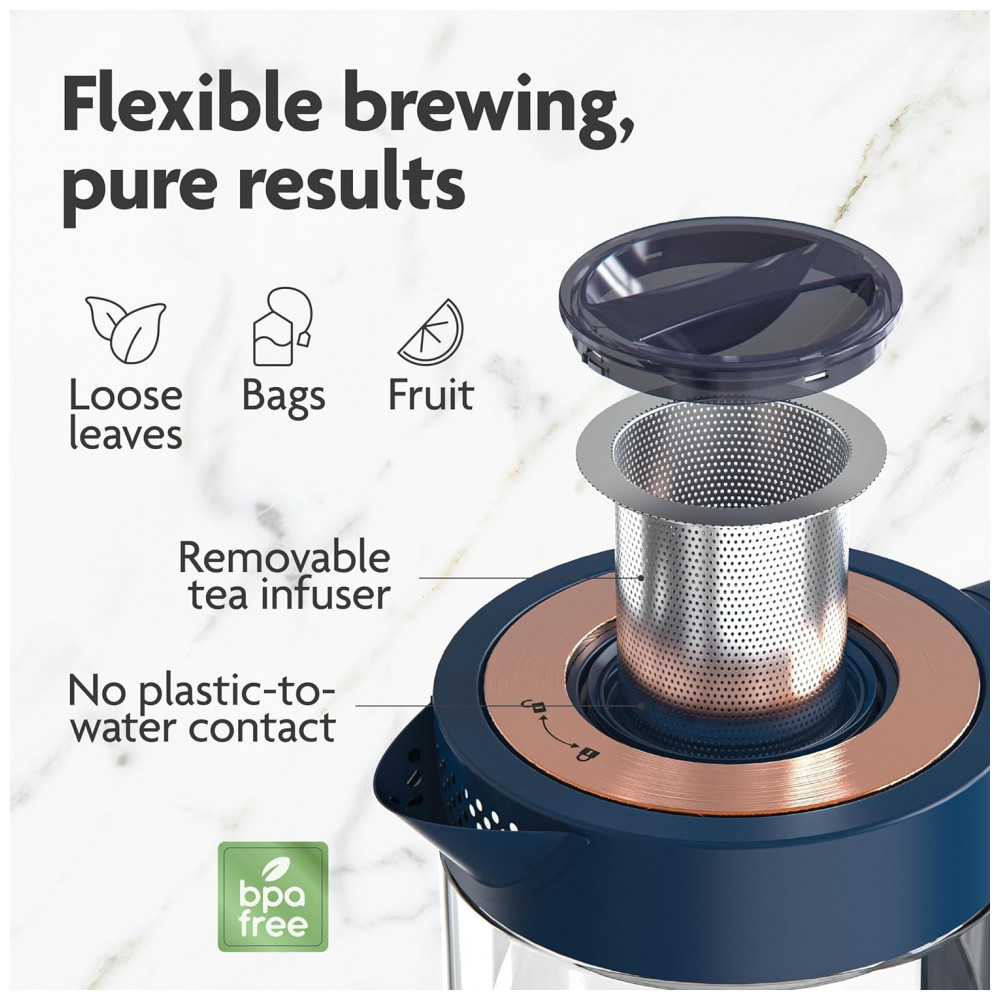 O jarro de vidro transparente não apenas confere um charme especial, permitindo que você acompanhe o processo de aquecimento, mas também é resistente e fácil de limpar. A capacidade generosa de 1,5 litros garante que você possa preparar grandes quantidades de água quente para chás, cafés ou outras bebidas.