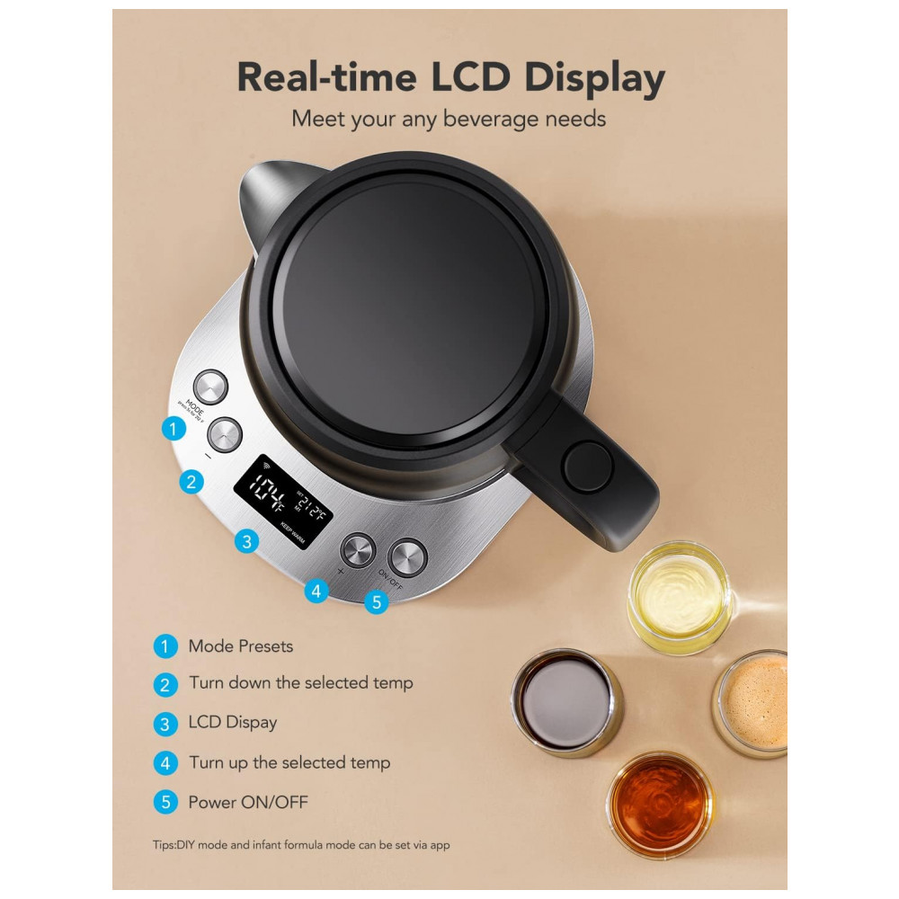 Controle de temperatura em grau A chaleira elétrica de temperatura variável possui 4 predefinições que podem ser definidas através do botão ou aplicativo. Defina o entre 104 F 212 F 40 a 100C ou faça o seu modo. Faça chá ou café perfeito e preciso, seja um iniciante ou um profissional.