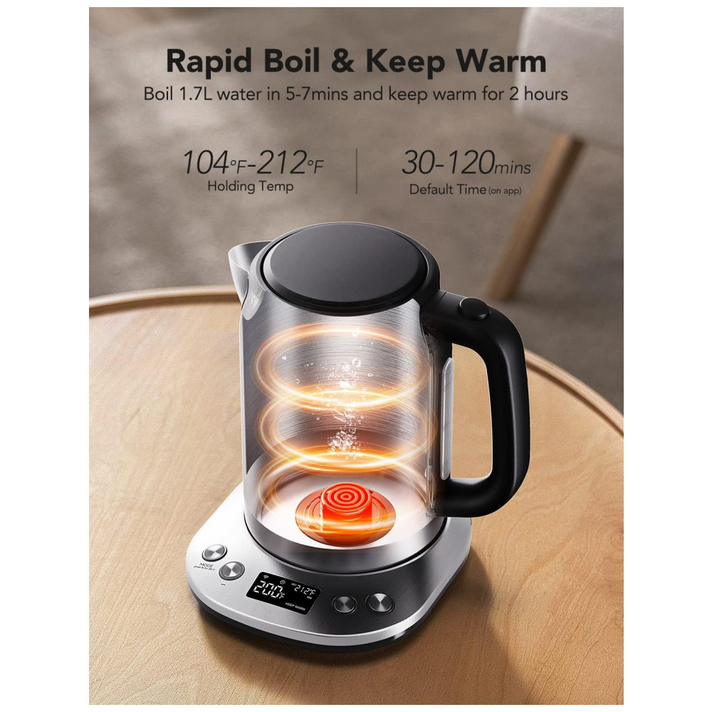 Ferva rápida e mantenha se aquecido a chaleira elétrica aquece 7 xícaras , 1,7 litros de água em 5 7 minutos com potência de 1500W e pode se aquecer por até 2 horas. Satisfaça suas necessidades de água a qualquer momento. Ajuste o tempo de temperatura de retenção no aplicativo.